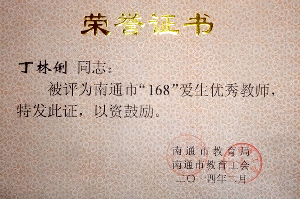 我校丁林俐老师被评为南通市“168”爱生优秀教师