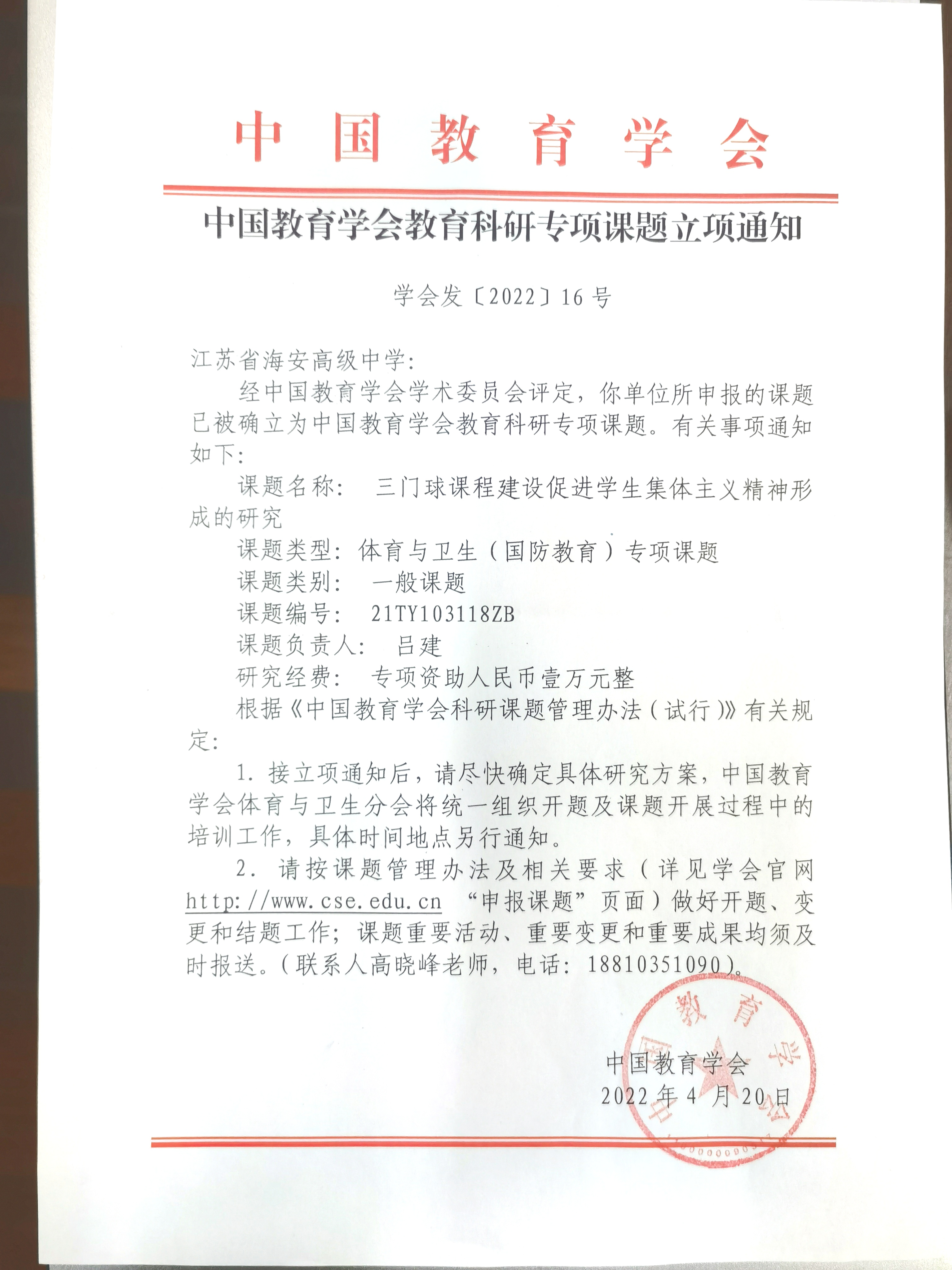 2022年4月20日,我校申报的“三门球课程建设促进学生集体主义精神形成的研究”被确立为中国教育学会教育科研专项课题(体育与卫生)。课题编号为:21TY103118ZB。