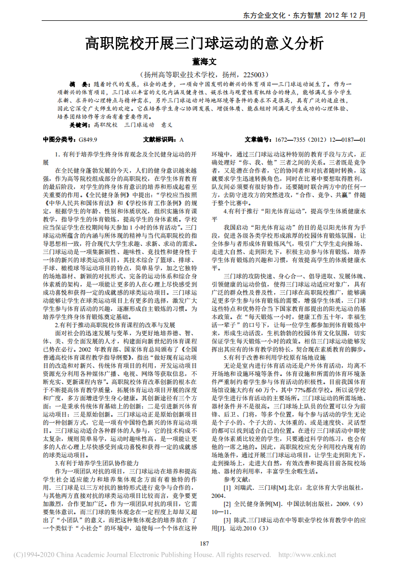 高职院校开展三门球运动的意义分析