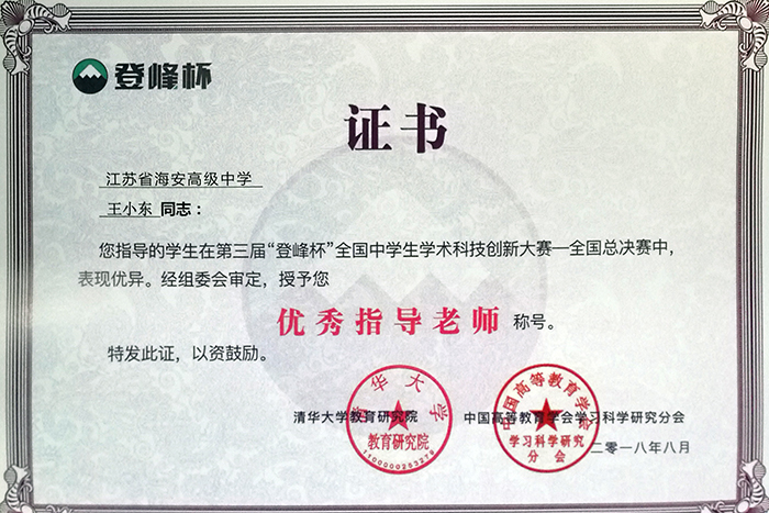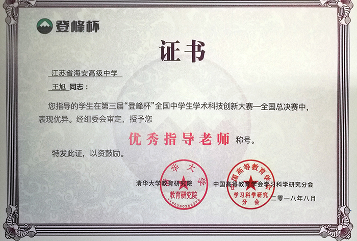 2018年8月6日至9日,第三届“登峰杯”全国中学生结构设计竞赛全国总决赛在北京举行,从初赛中脱颖而出的60支高中生团队参加了本次比赛,决赛设一、二、三等奖和入围奖。海安中学学子孙雯、吴江哲组成的代表队发挥出色,勇夺一等奖,王陈阳、景虹瑞、田朝旭组成的代表队获三等奖。海中物理组的王旭、王小东老师也被大赛组委会授予“优秀指导老师”荣誉称号。