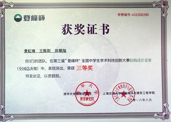海中学子在第三届“登峰杯”全国中学生结构设计总决赛中获一等奖