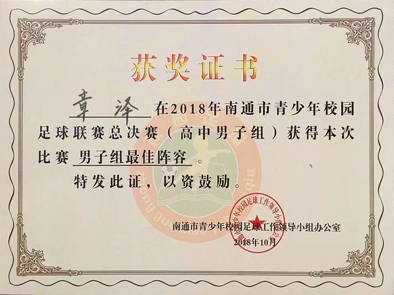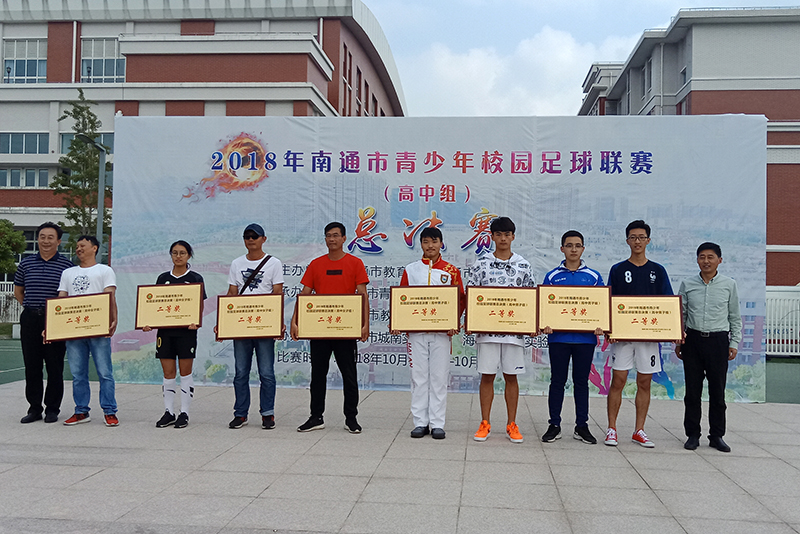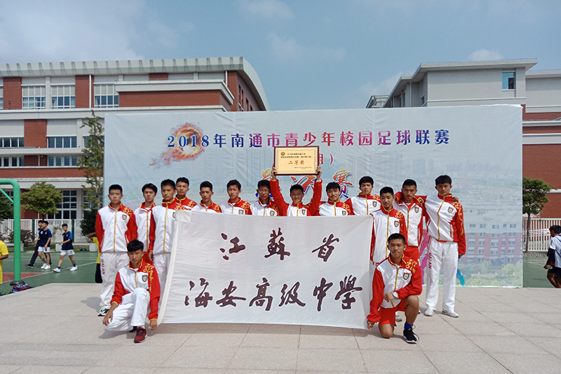 10月4至7日,2018年南通市青少年校园足球联赛(高中组)总决赛在海安市城南实验学校举行,全市14支代表队参加了比赛。海安中学积极组队参赛。海中16名队员团结协作,顽强拼搏,在小组赛首场失利的情况下,愈战愈勇,在进入下一轮的比赛中,一球未失连下三城。最终获得比赛第五名(二等奖第一名)。章泽同学获得本次比赛男子组“最佳阵容”奖;薛枢执同学获得本次比赛“最佳守门员”。比赛期间,海安中学队员因严于律己,尊重对手,服从裁判,赢得了大会组委会和参赛各队的充分肯定。