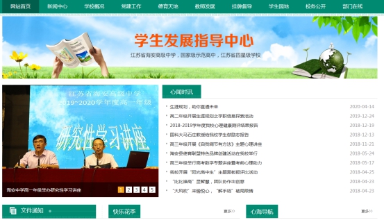 学校主页设有学生发展指导中心专栏,分“心闻时讯”“快乐花季”“心海导航”“家教天地”“生涯指导”“文件通知”等栏目内容,欢迎感兴趣的同学关注。