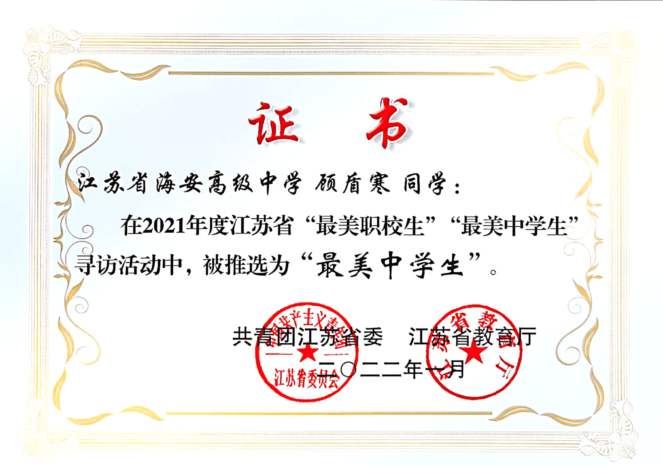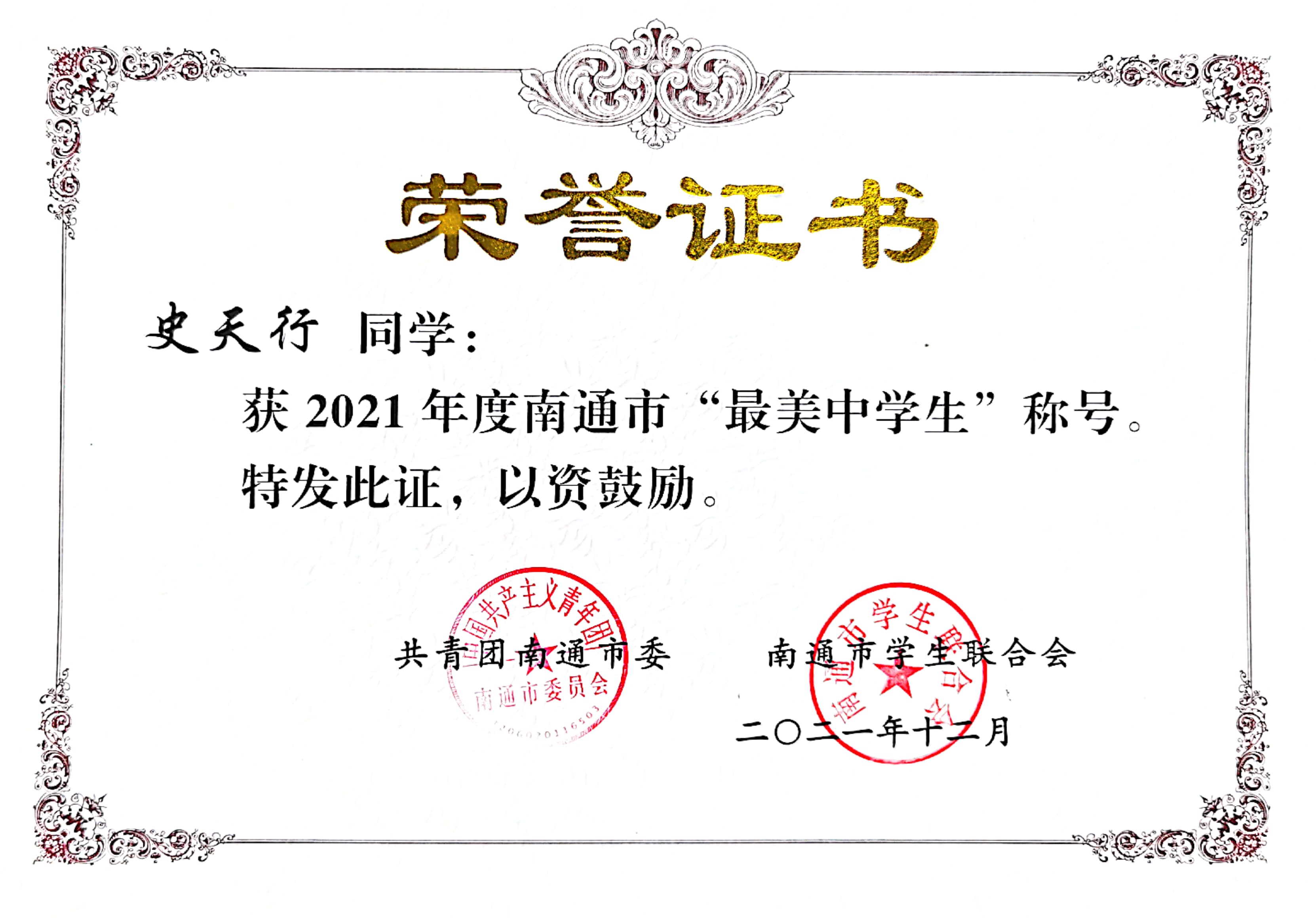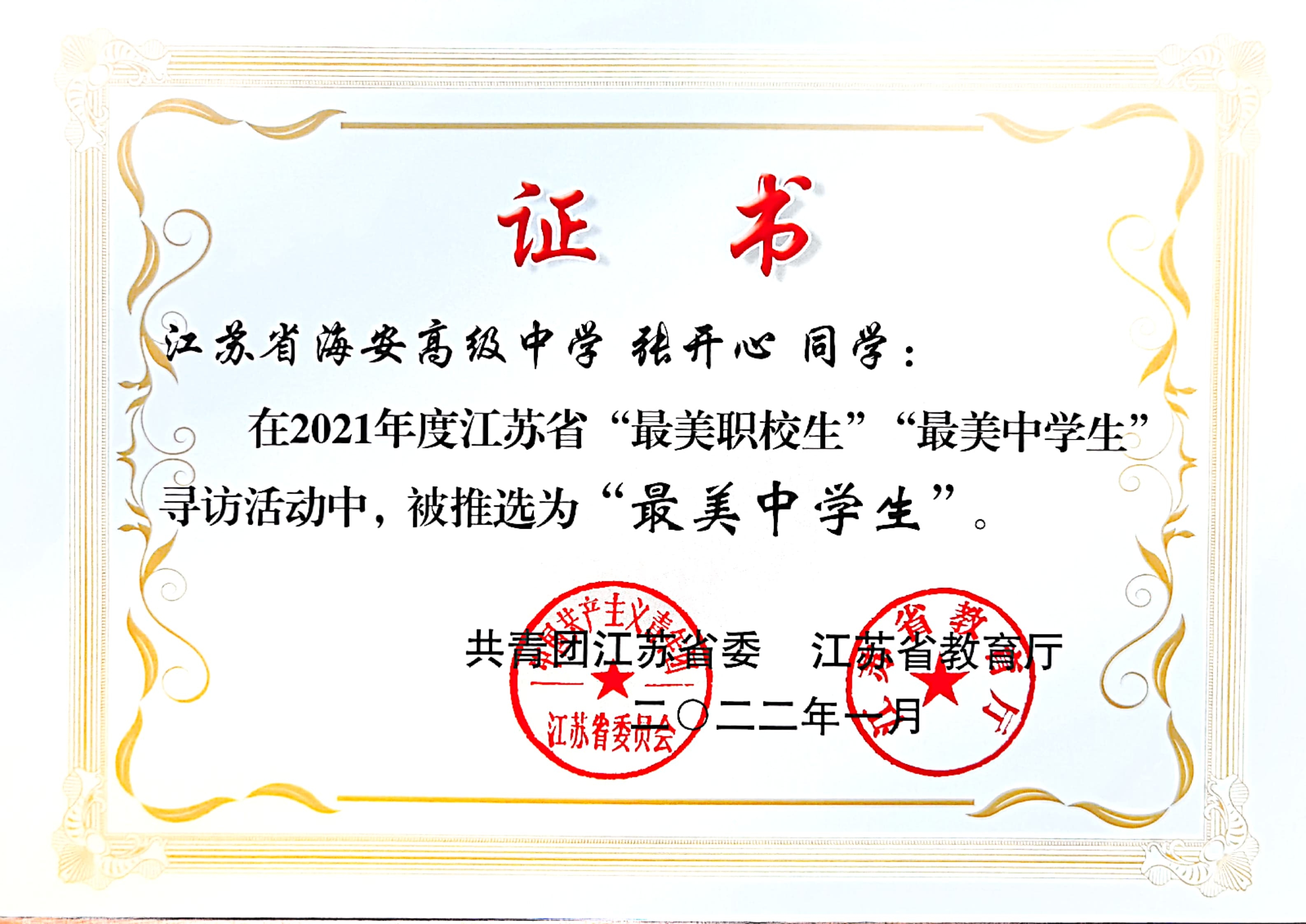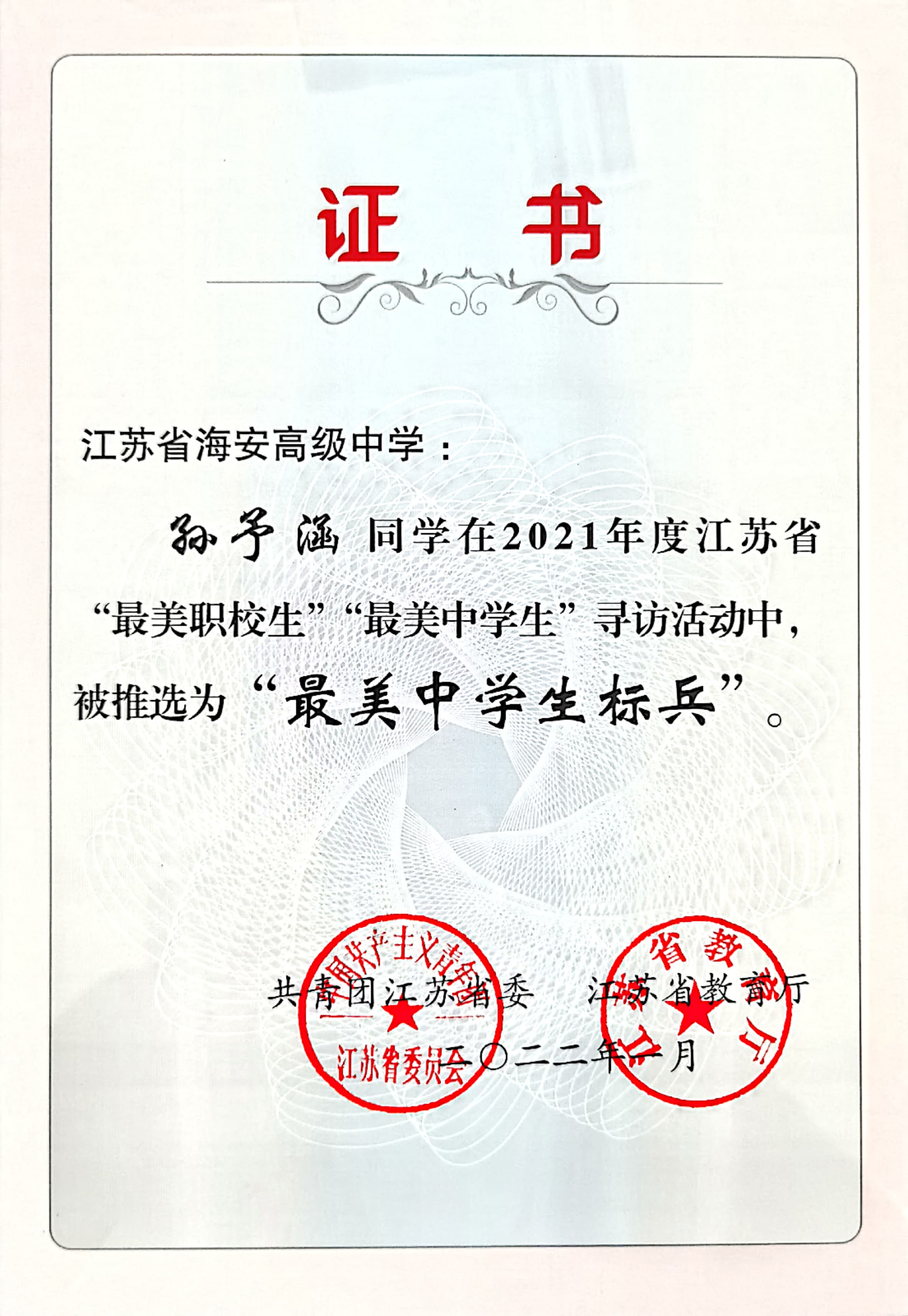 共青团江苏省委、江苏省教育厅公布2021年全省寻访“最美中学生”“最美中职生”活动结果。9323彩集团孙予涵同学获江苏省“最美中学生标兵”称号,顾盾寒同学、张开心同学获江苏省“最美中学生”称号,史天行同学、刘鸿瑞同学获南通市“最美中学生”称号。