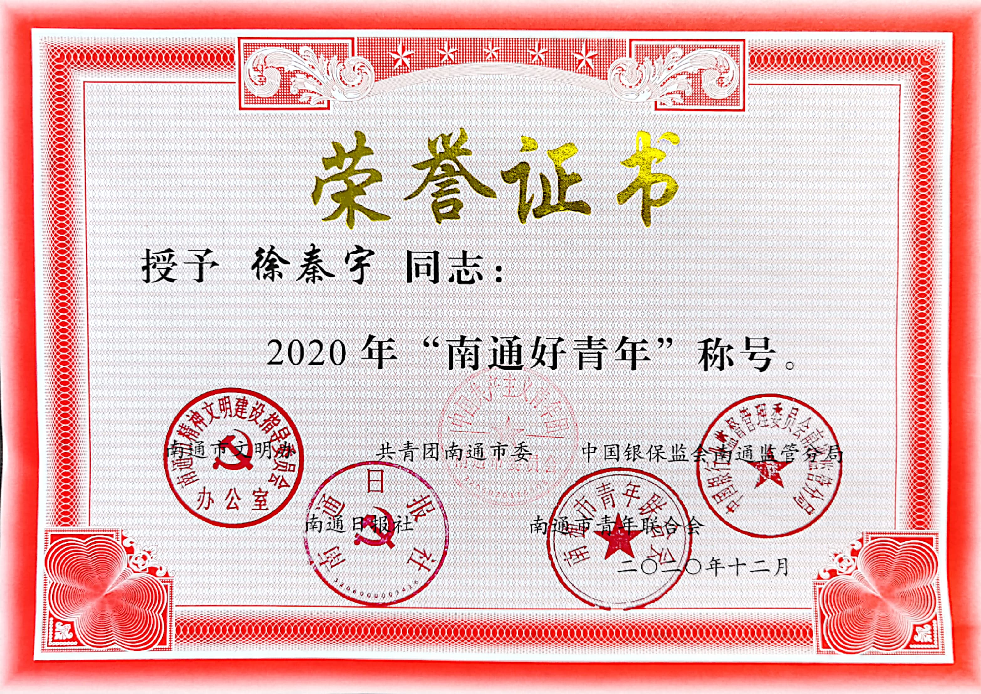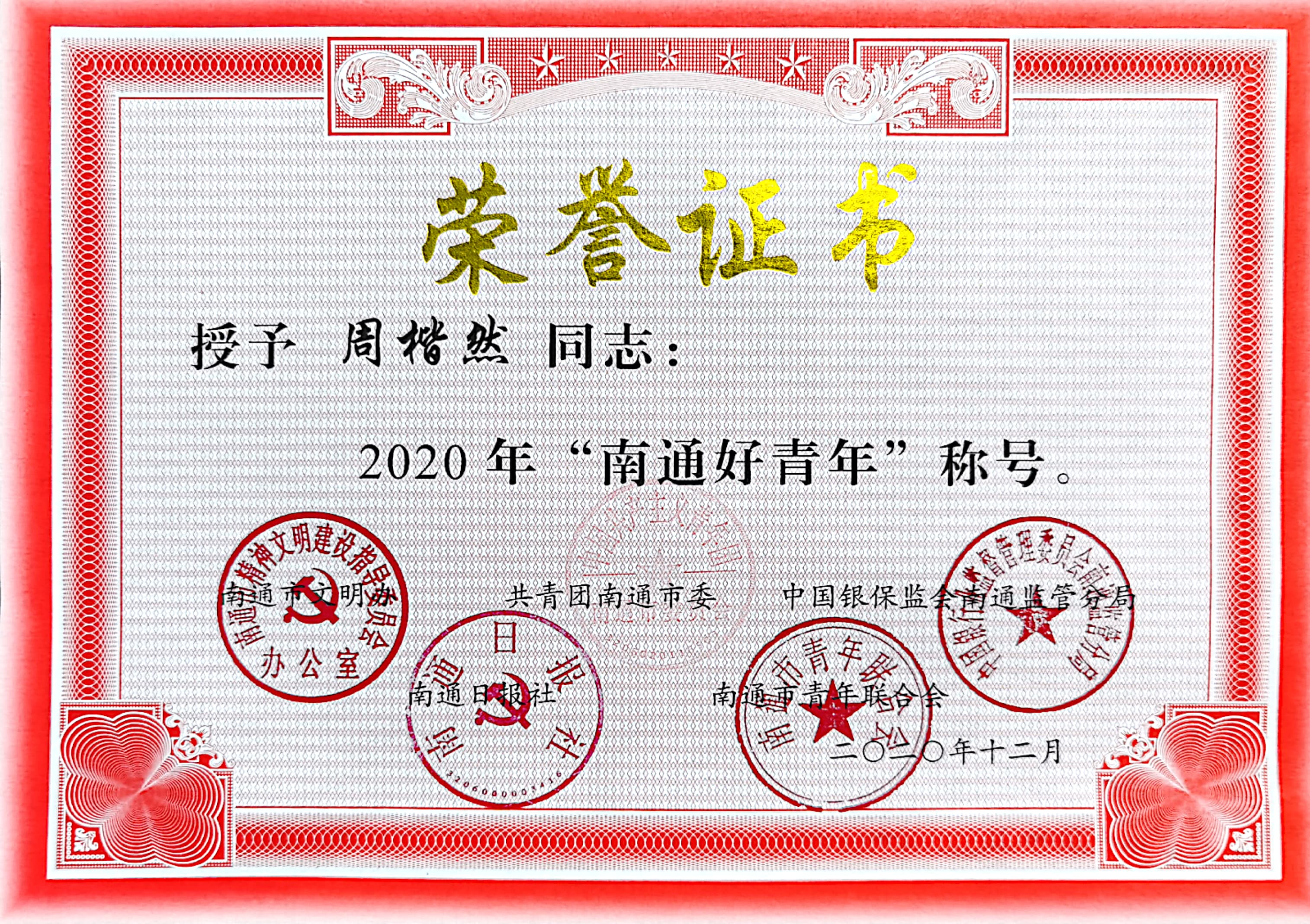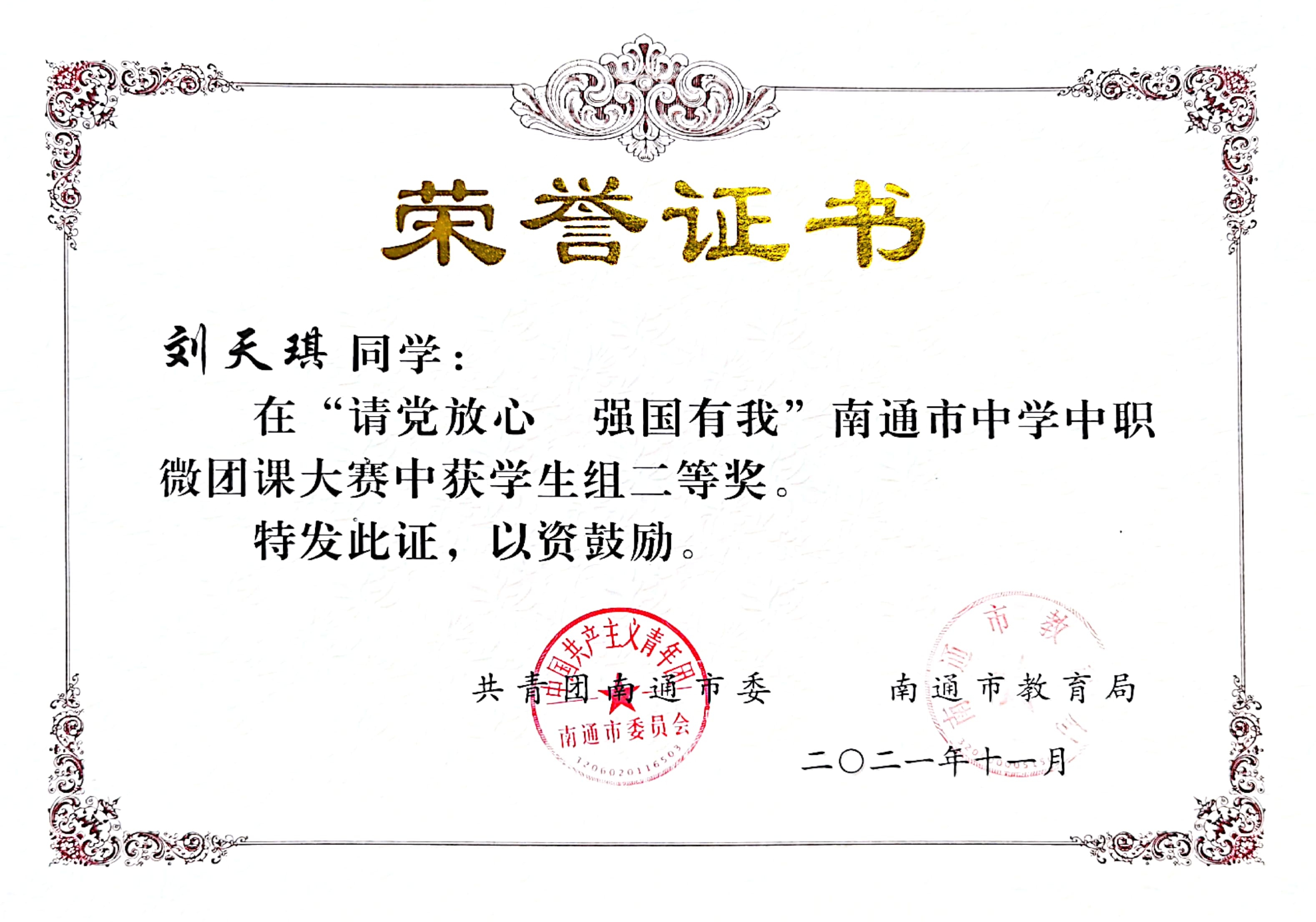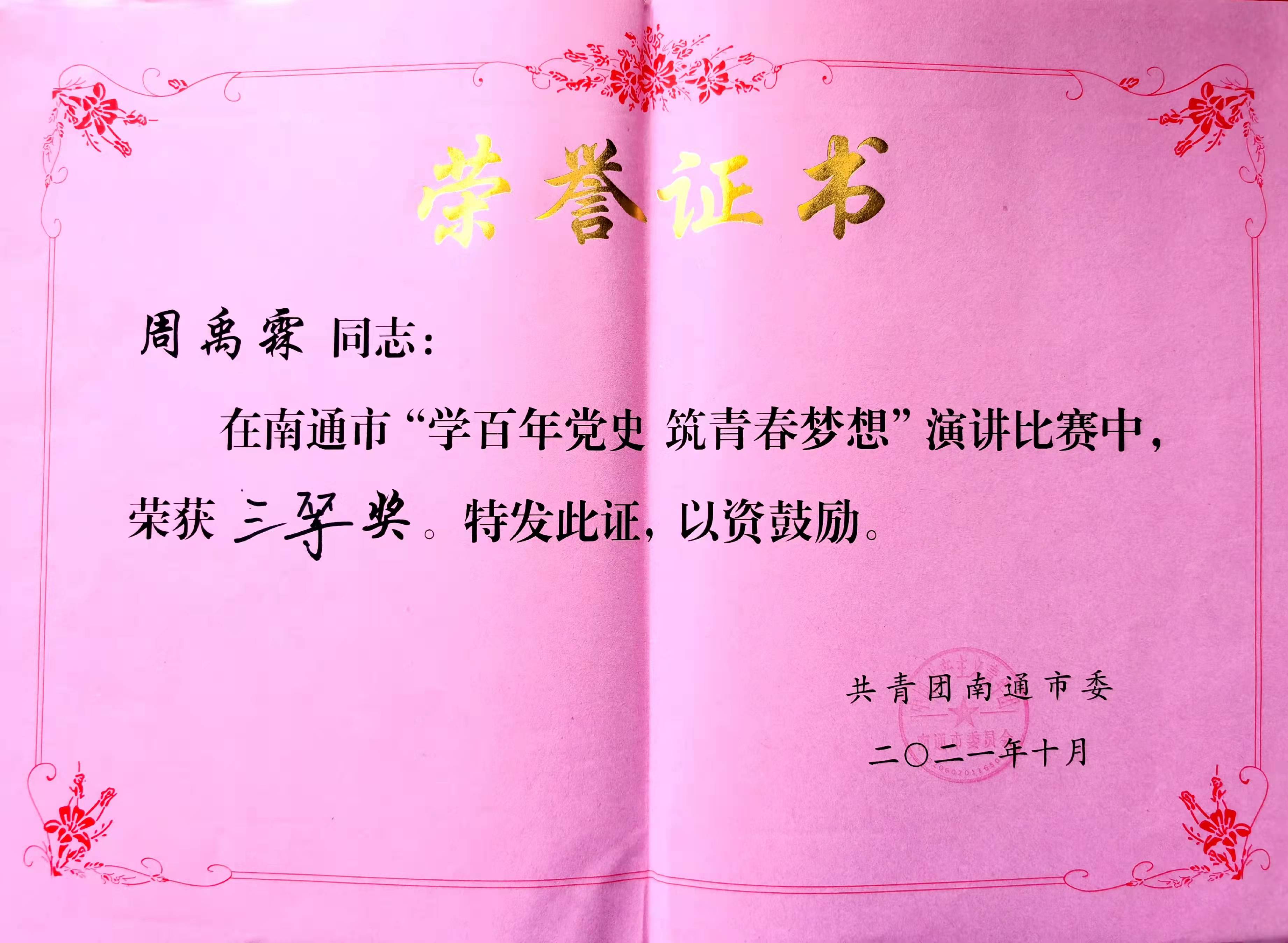 在南通市“学百年党史 筑青春梦想”演讲比赛中,周禹霖同学获三等奖。周楷然、徐秦宇被授予2020年“南通好青年”称号。
