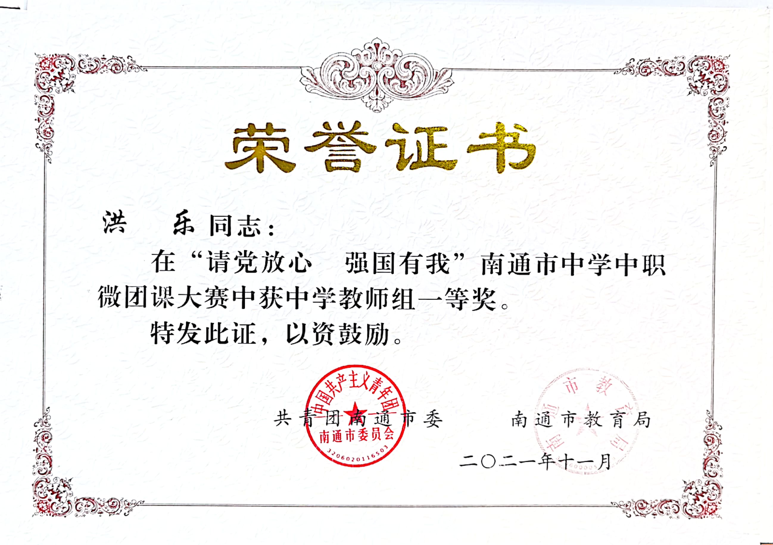 在“请党放心 强国有我”南通市中学中职微团课大赛中,洪乐老师获中学教师组一等奖,刘天琪同学获学生组二等奖。