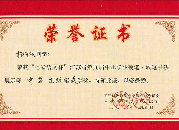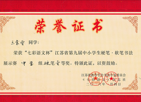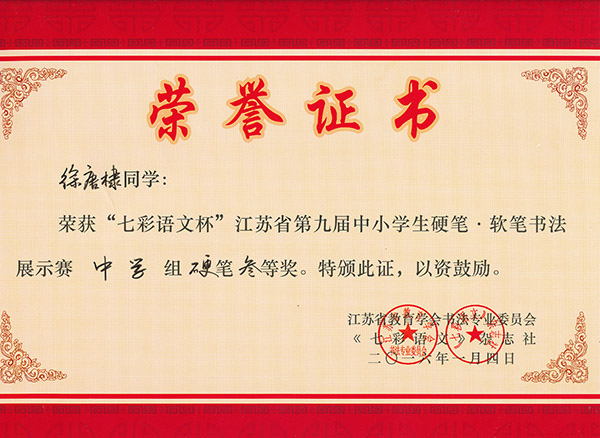 我校五名学生在省硬笔软笔书法比赛中获奖 来源: 发布时间:2016-09-09 00:00:00 浏览次数: 次 【字体:小 大】 喜 报 在2016年“七彩语文杯”江苏省第九届中小学生硬笔•软笔书法展示赛中,我校多名同学取得优异的成绩。特向全校师生报喜! 省一等奖: 王袁睿(中学组 硬笔壹等奖) 省二等奖: 杨可欣(中学组 软笔贰等奖)、成天奕(中学组 硬笔贰等奖) 省三等奖: 曹思洁(中学组 硬笔叁等奖)、徐唐棣(中学组 硬笔叁等奖) 9323彩集团 2016.9.9 分享到: 【打印正文】