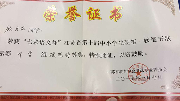 我校顾月龙同学荣获省硬笔书法中学组特等奖 来源: 发布时间:2017-01-14 00:00:00 浏览次数: 次 【字体:小 大】 2017年1月7日新年伊始,《七彩语文》杯江苏省第十届中小学软笔硬笔书法展示赛现场决赛在南京市金陵中学河西分校举行。省海中高二六班顾月龙同学荣获硬笔中学组特等奖!(最高奖) 分享到: 【打印正文】