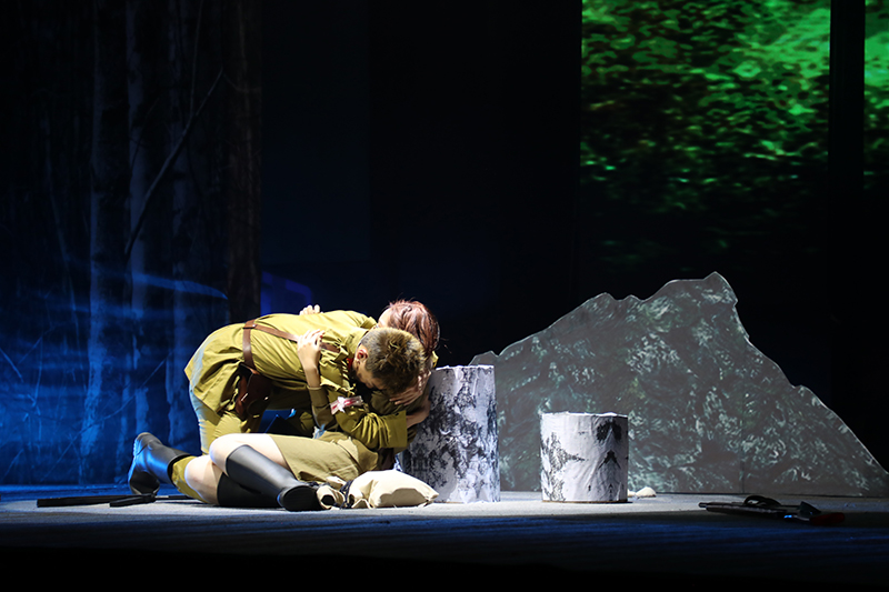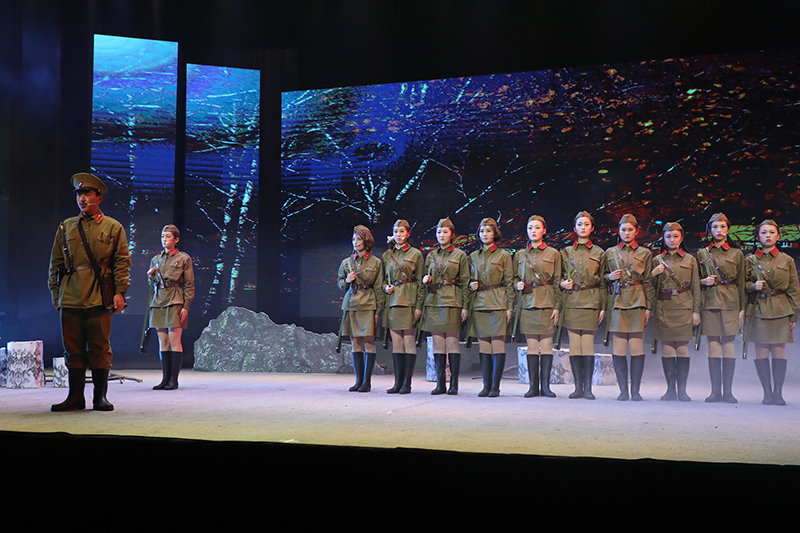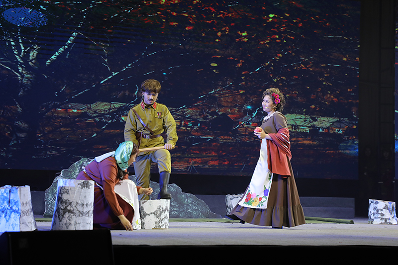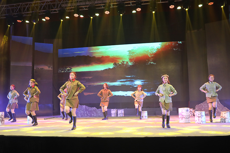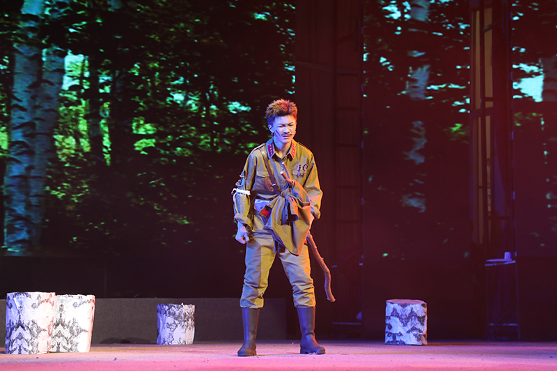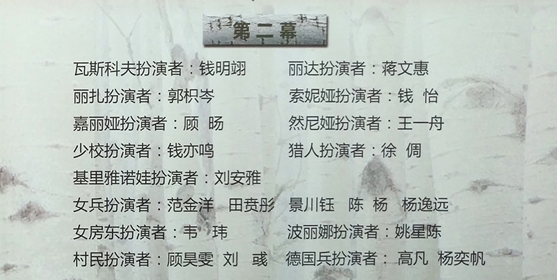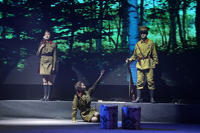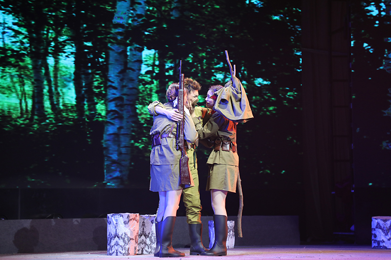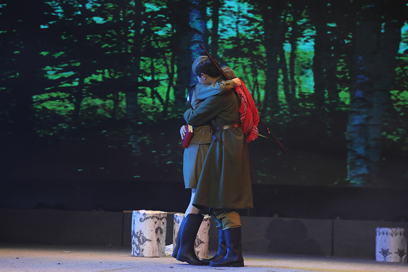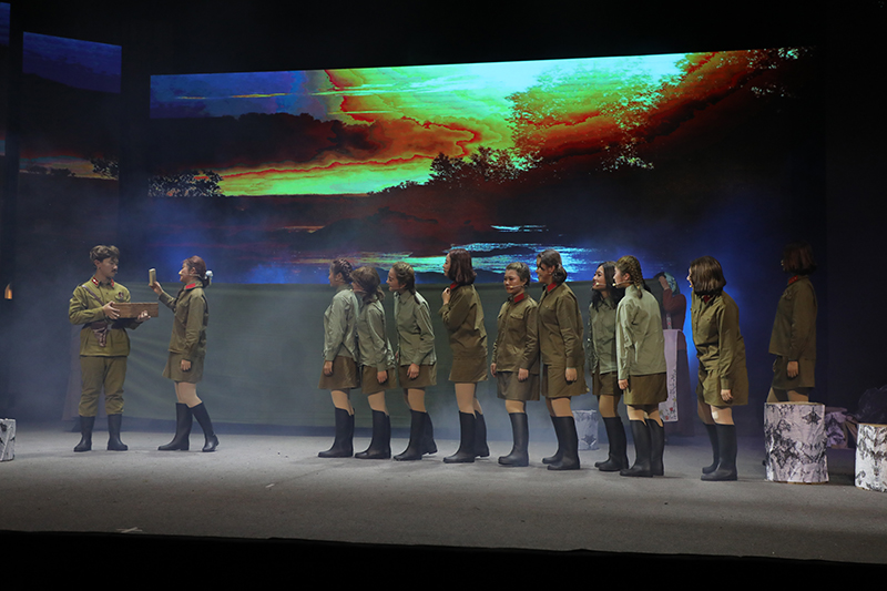 话剧《这里的黎明静悄悄》根据前苏联同名小说改编,讲述了卫国战争时期,5位对爱情、对生活有着美好憧憬的花季女兵,在准尉的带领下英勇抗击德寇,最终牺牲在白桦林中的故事,引发人们对侵略战争的思考和对人性的多元理解。故事情节跌宕起伏,扣人心弦。来自高一年级18个班级的52位学生演员联袂出演,三幕联排同台呈现,用极具张力的表演,塑造了一个又一个鲜活生动的人物形象,深深地感染了每一位到场的观众。