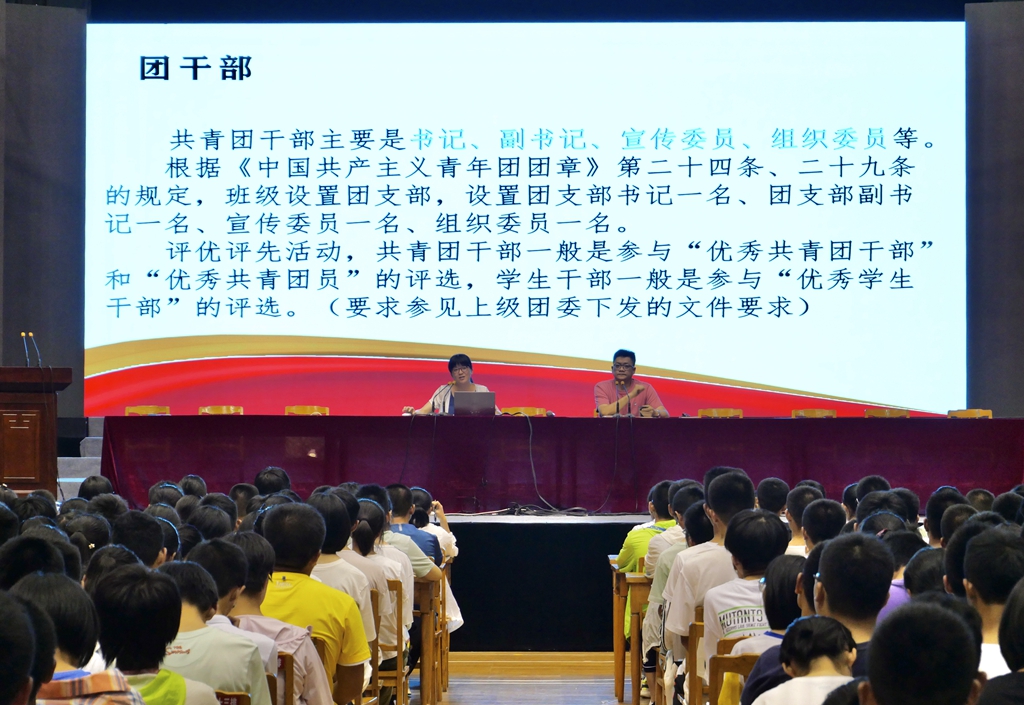 8月12日晚,我校组织高一新生在学校体艺馆参加了“恰同学少年——基础团务知识培训及学生社团活动介绍”活动。活动由学校团委书记许尧主讲,学校科研处副主任吉晓军主持。