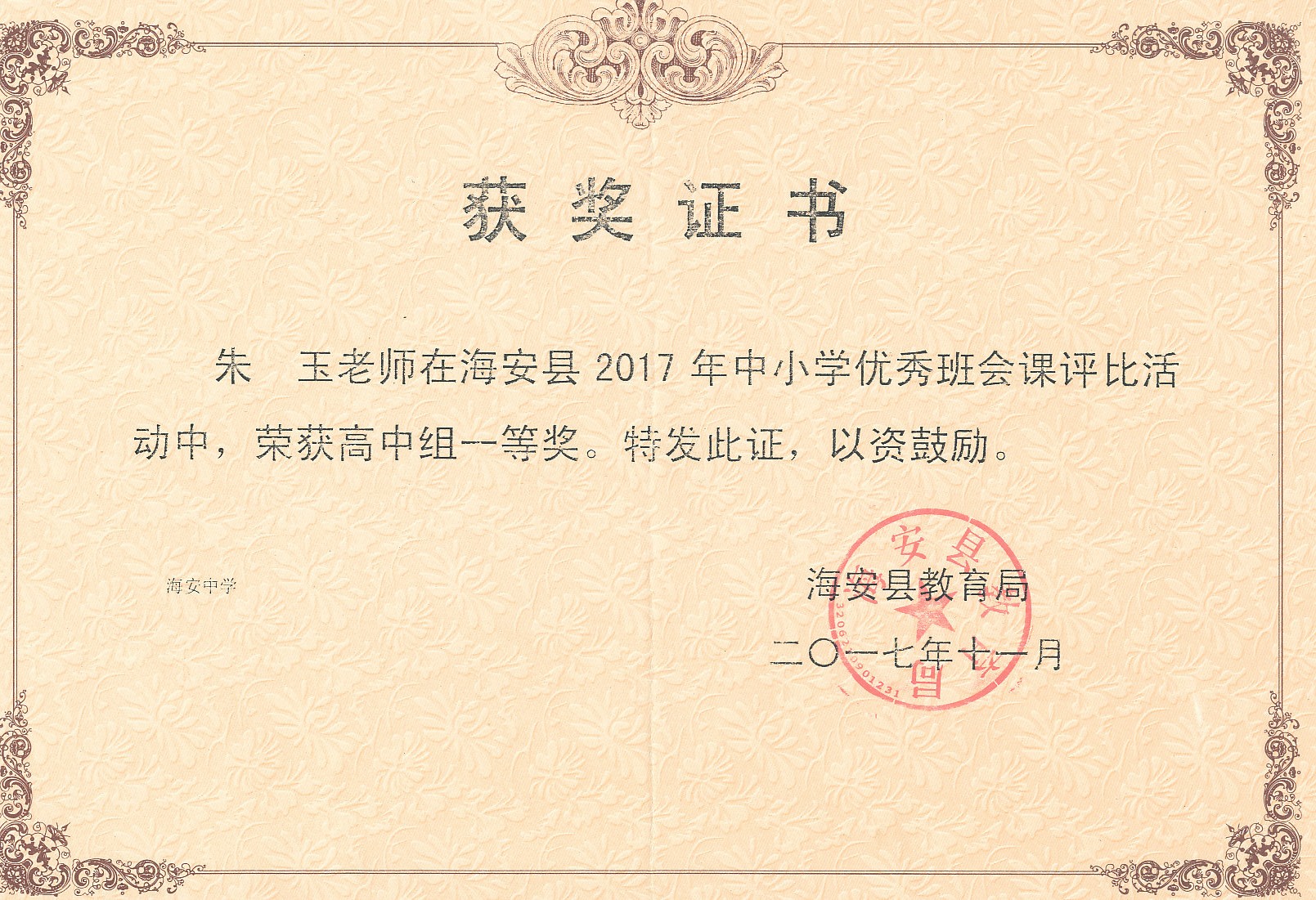 朱玉老师在海安县2017年优秀班会课评比中荣获高中组一等奖