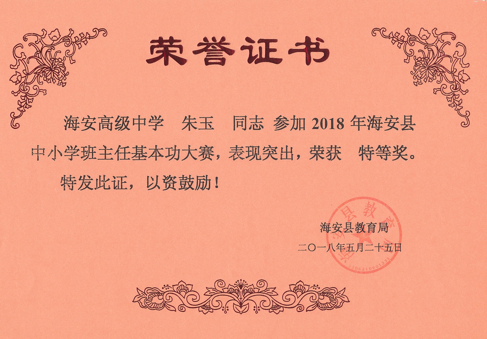 朱玉老师在2018年海安县班主任基本功大赛中荣获特等奖