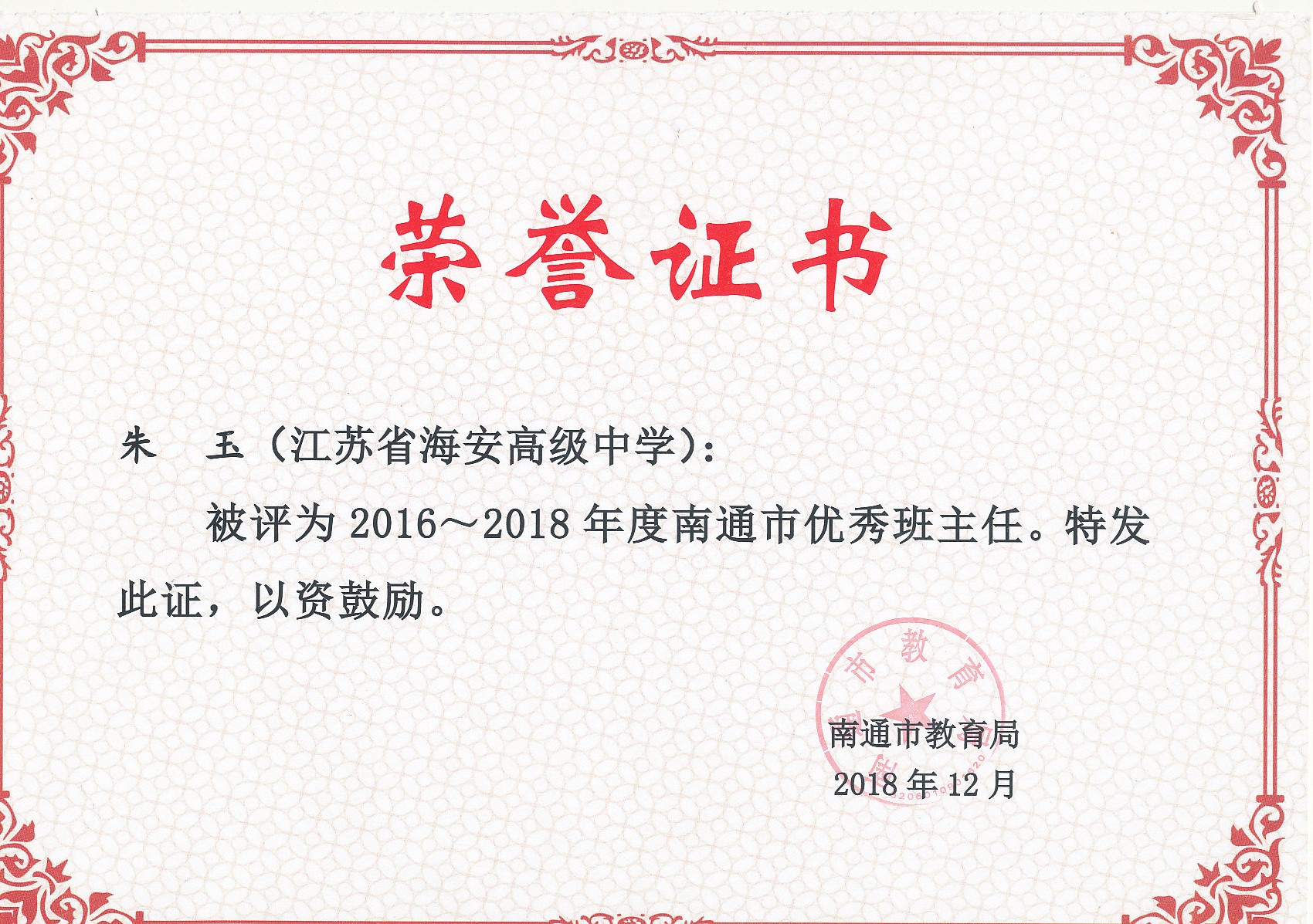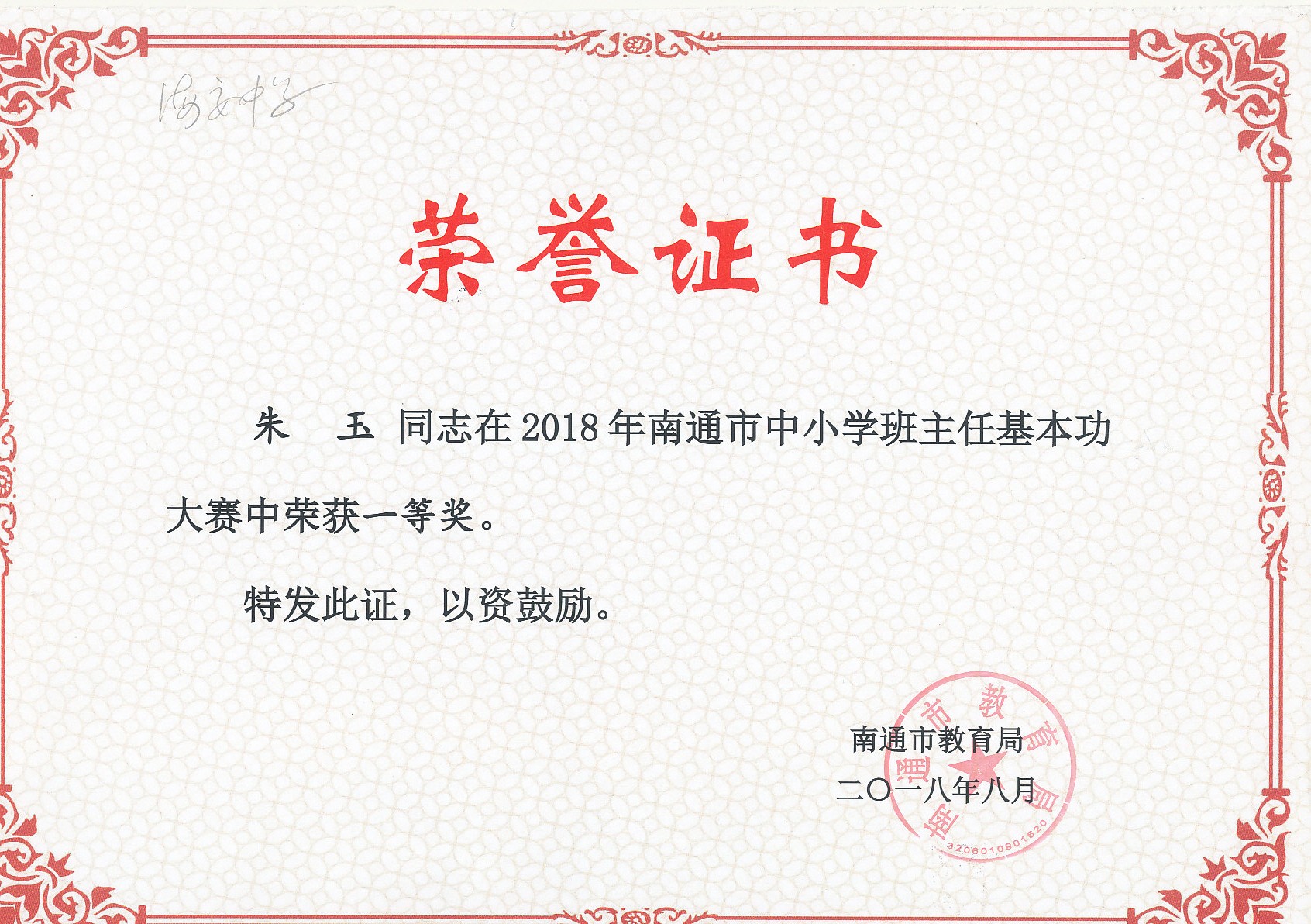 朱玉老师在2018年南通市班主任基本功大赛中荣获一等奖