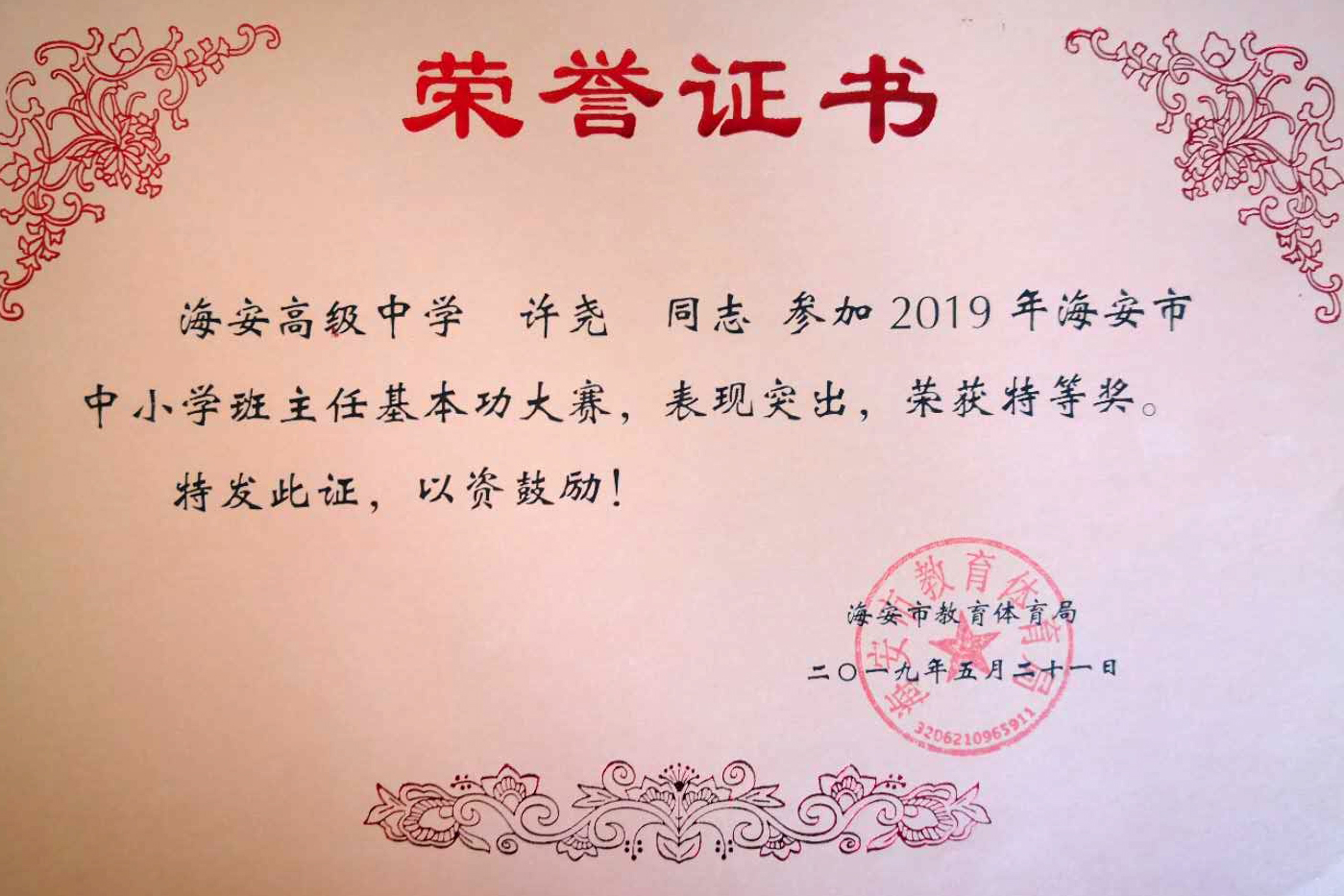 许尧老师在海安市班主任基本功大赛荣获特等奖