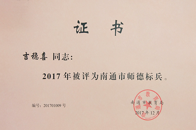 祝贺我校吉稳喜老师2017年被评为南通市师德标兵