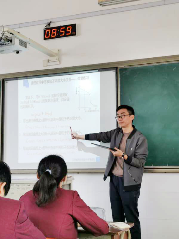 海安中学化学教研组高一年级储呈俊老师和高二年级季春旭老师分别上了公开课《气体摩尔体积》和《氢氧化钠滴定醋酸过程中溶液粒子浓度的大小关系》,两节课从生活出发,依据新教材,结合新课标,面向新高考,达到了学科素养的培养和专业知识的学习双重目标,得到了听课老师一致的好评。