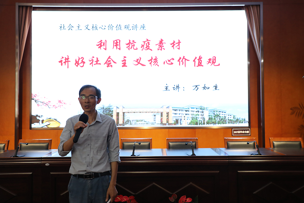 比赛结束后,政治组教研组长万如生老师以“利用抗疫素材,讲好社会主义核心价值观”为题,进行了社会主义核心价值观专题教学培训活动。万老师按照习近平总书记在学校思想政治理论课教师座谈会提出的推动思政课改革创新“八个统一”的要求,示范了如何把中国抗击疫情的生动实践转化为思政课的教学素材,教育和引导青年学生正确认识世情、国情,增强“四个意识”、树立“四个自信”,自觉践行社会主义核心价值观,做德智体美劳全面发展的社会主义建设者和接班人。