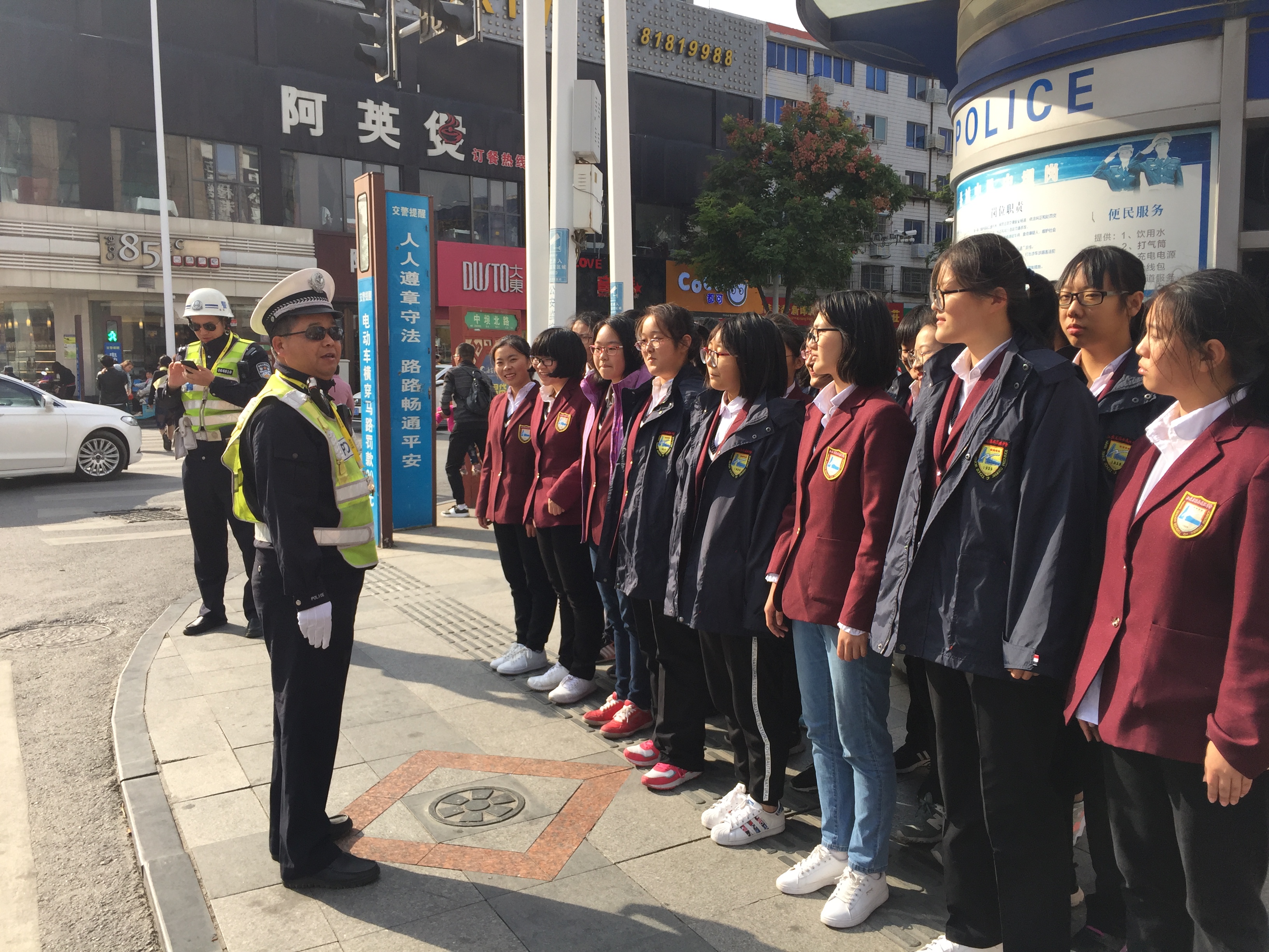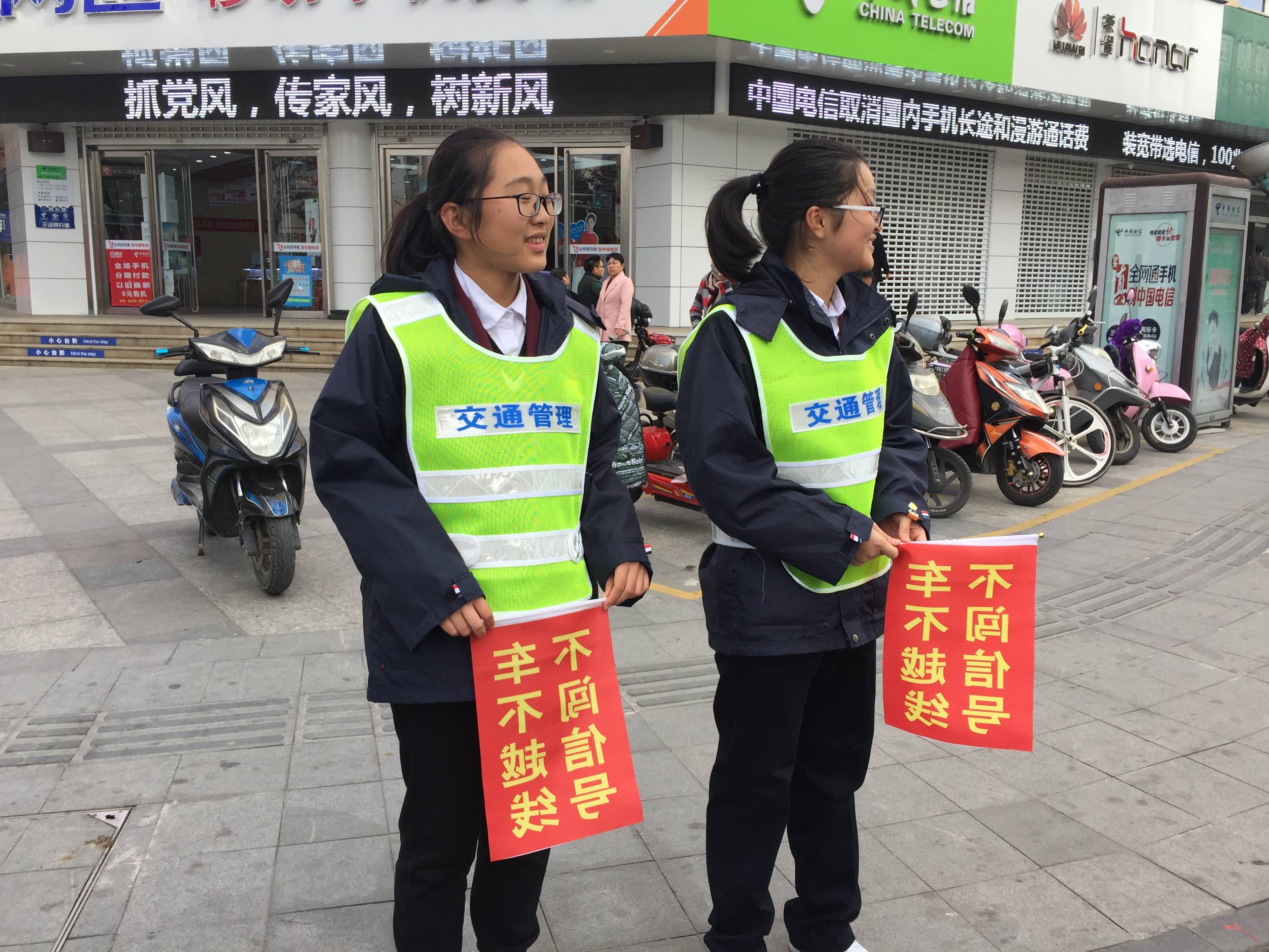 站在十字路口的交接处,车流,人流如潮,起初难免有几分尴尬随着是时间的推移,逐渐熟络起来,我们也学会了微笑着提醒行人“遵守交通规则,勿踩线,勿逆行”。