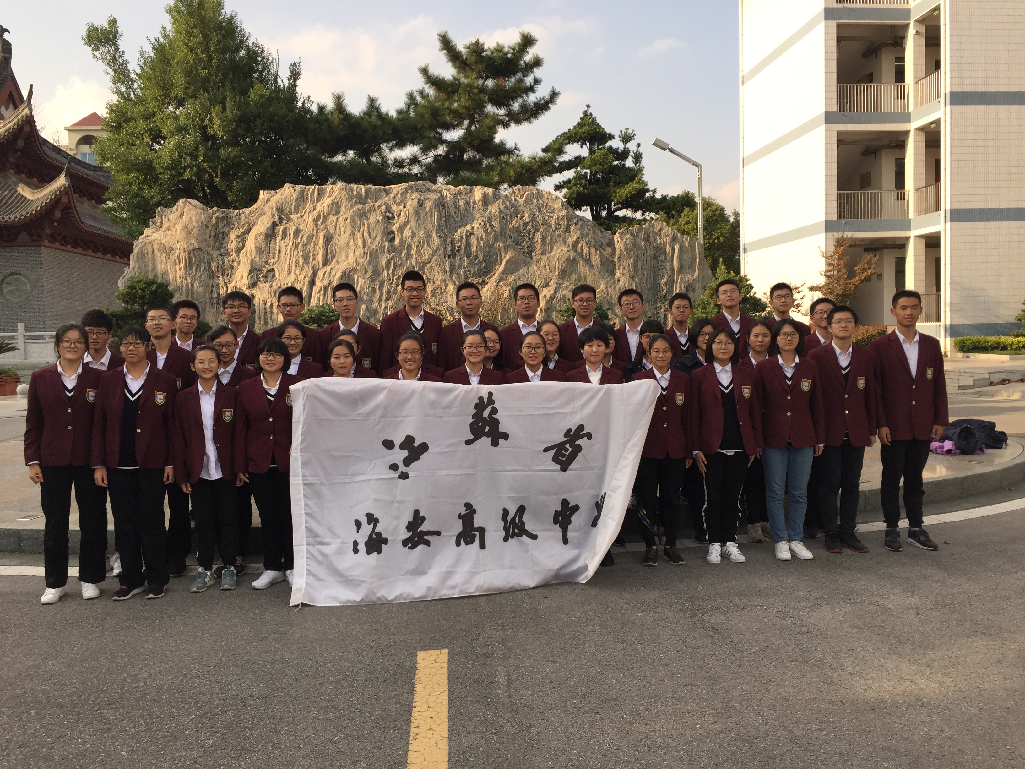 顺利完成了社会实践活动,同学们奏凯而归,在学校的山石广场,举着校旗,记录下了这富有教育意义的一幕。