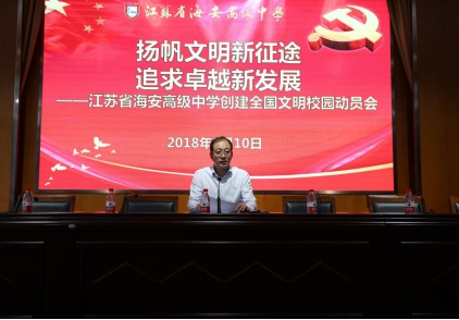 学校党委书记、校长吕建作了题为《扬帆文明新征途,追求卓越新发展》的动员报告。他首先指出全国文明校园创建是贯彻落实习近平总书记关于精神文明建设的新遵循、新任务,是进一步培育和践行社会主义核心价值观,提升师生文明素养和校园文明程度的重要举措,对学校全面落实立德树人根本任务和推进学校高品质示范高中建设具有重要的意义。接着他从提升创建成效的角度对创建全国文明校园工作提出了四个个方面的要求:一是统一思想、提高认识,增强文明校园创建的紧迫感。二是聚焦标准、展示亮点,提升创建文明校园的整体水平。三是统筹协调,广泛动员,凝聚文明校园创建的融合力。四是明确责任,落实奖惩,提高文明校园创建的责任感。五是要加强领导,强化引领,积极营造文明校园创建好氛围。