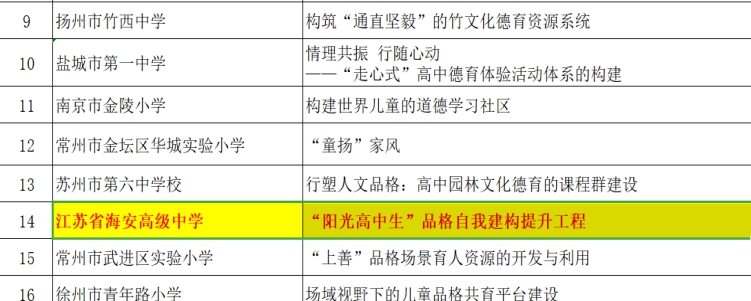 海安中学“阳光高中生”品格自我建构提升工程荣获江苏省中小学生品格提升工程建设项目