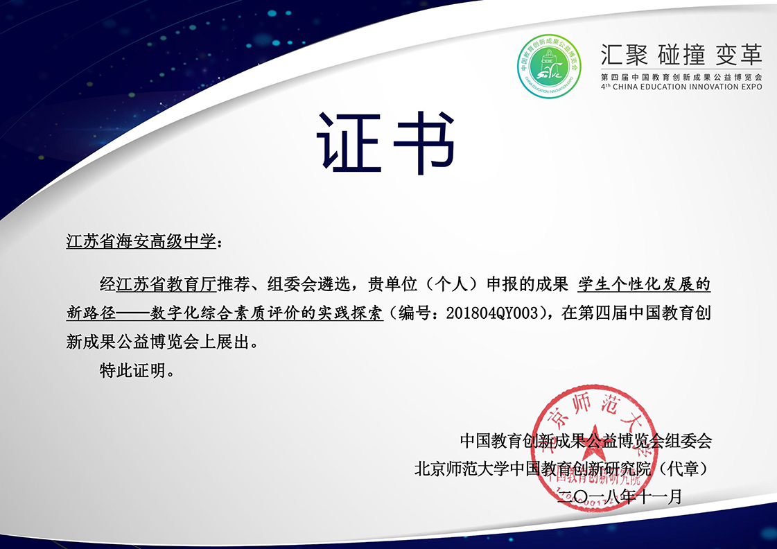 近日,教育部公布了 2018 年国家级教学成果奖获奖项目,海安高级中学研究项目“评价育人:依托成长记录平台提升学生综合素质的实践”荣获2018年基础教育国家级教学成果奖二等奖。