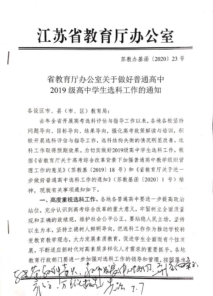 现将江苏省教育厅《省教育厅办公室关于做好普通高中2019级高中学生选科工作的通知》转发给你们。希各学校认真学习、研究文件精神,按照文件要求做好2019级高中学生选科工作。