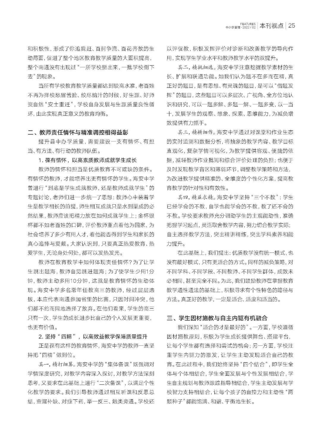 提升县中办学水平,仅仅靠学校自身的努力还远远不够,但没有学校和教师的积极努力更是举步维艰。海安中学的实践表明,学校把自己能做的、该做的事做好了,腰板就能挺起来,话语权也重了,对政府、社会和家庭的影响力随之增大,对提高办学水平、改善教育生态也更有利。