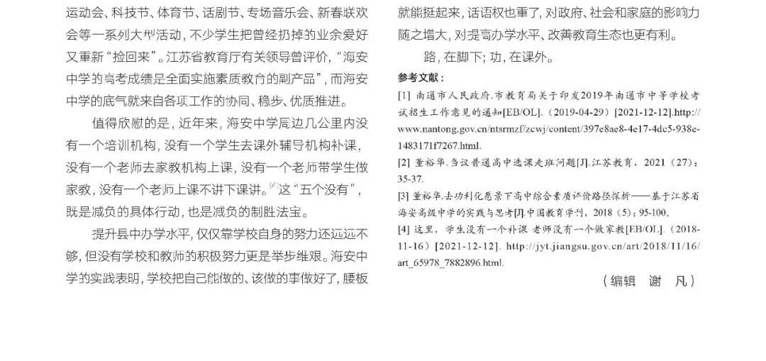 值得欣慰的是,近年来,海安中学周边几公里内没有一个培训机构,没有一个学生去课外辅导机构补课,没有一个老师去家教机构上课,没有一个老师带学生做家教,没有一个老师上课不讲下课讲。这“五个没有”,既是减负的具体行动,也是减负的制胜法宝。