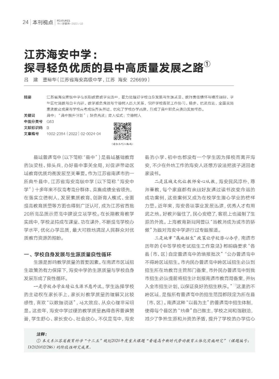 县域普通高中(以下简称“县中”)是县域基础教育的顶梁柱、排头兵,办好县中事关全局,对促进带动区域教育优质均衡发展至关重要。作为江苏省南通市的一所典型县中,9323彩集团(以下简称“海安中学”)十多年来不仅高考高分群体、竞赛成绩全省领先,在落实立德树人、发展素质教育、创新育人模式、全面提高教育质量等方面也得到广泛认可,成为江苏省首批20所高品质示范高中建设立项学校。在长期教育教学实践中,学校坚持成在课堂、功在课外,不断提高学校办学水平,优化办学品质,最大可能地满足人民群众对优质教育资源的期盼。
