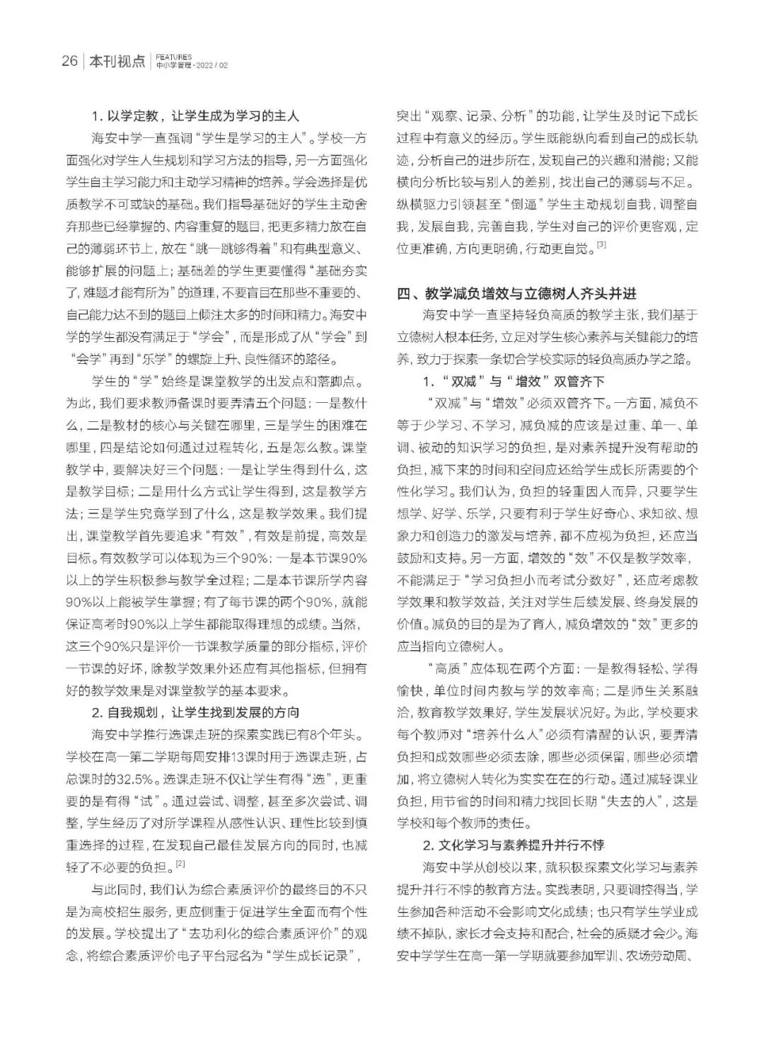 “高质”应体现在两个方面:一是教得轻松、学得愉快,单位时间内教与学的效率高;二是师生关系融洽,教育教学效果好,学生发展状况好。为此,学校要求每个教师对“培养什么人”必须有清醒的认识,要弄清负担和成效哪些必须去除,哪些必须保留,哪些必须增加,将立德树人转化为实实在在的行动。通过减轻课业负担,用节省的时间和精力找回长期“失去的人”,这是学校和每个教师的责任。