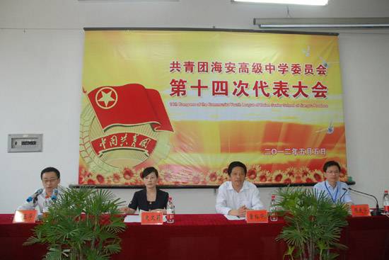 <!--?namespace prefix = st1 ns = "urn:schemas-microsoft-com:office:smarttags" ????-->2012年5月5日下午,共青团海安高级中学委员会于奥林匹克楼隆重召开了第十四次代表大会。来自全校46个班级的143名团员代表出席了大会,安保处主任顾玉华同志主持了大会,团委代书记顾庆华同志代表第十三届团委向大会做了工作报告,海安团县委副书记史文莉同志、校长助理董裕华同志出席大会并做了重要讲话。大会选举产生了第十四届省海中共青团委员会,顾庆华同志当选为新一届团委书记,蒋雅乐同学当选为新一届团委副书记,万芝锋、罗湘军、许尧、叶梦颖等8名同志当选新一届团委委员。<!--?namespace prefix = o ns = "urn:schemas-microsoft-com:office:office" ????-->