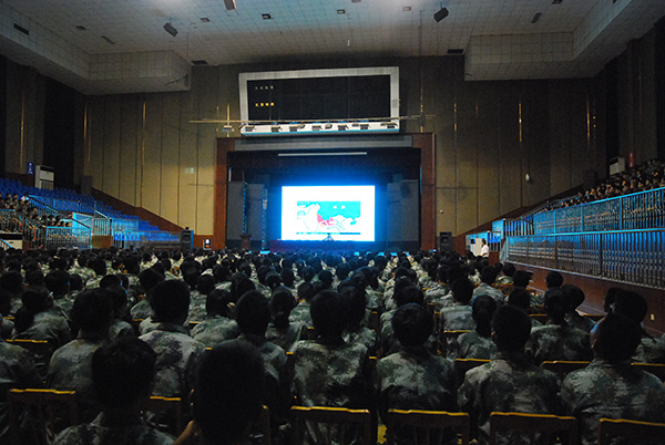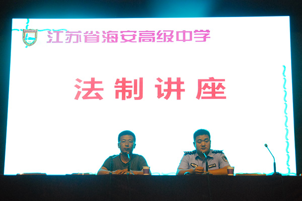 8月15日下午2:00,高一年级全体军训学员来到体艺馆,聆听由安保处顾玉华主任主持、海安县城北派出所王所长主讲的“法制讲座”。王所长主讲的题目是《与法同行,做遵纪守法好学生》。讲座的第一部分是有关毒品方面的问题,主要包括:国际毒品形势、我县毒品案例、吸毒的危害、中学生如何远离毒品等内容;第二部分是有关邪教方面的问题,主要包括:认清邪教、邪教的危害、邪教骗人的方法、如何远离邪教等内容;第三部分是有关做遵纪守法的好学生方面的问题,主要包括:常用的法律法规、常见的犯罪种类、未成年人的不良行为等内容。