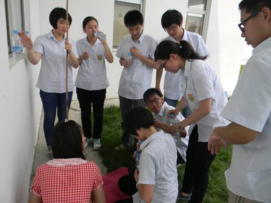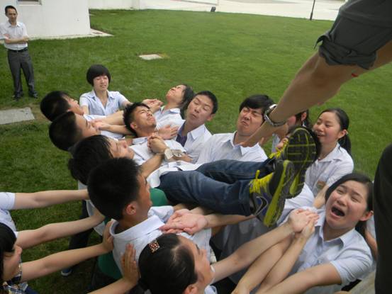 学生们在教官的指导下分成两组,做完准备活动后大家开展了第一个活动——信任背摔。当从高处的台上垂直向后倒下,但心中却感受到信任的力量,因为其余的所有队员用手臂搭起一张坚实的网,稳稳地托起坠下的队员。此刻,团队合作的精神让每个人受益匪浅。