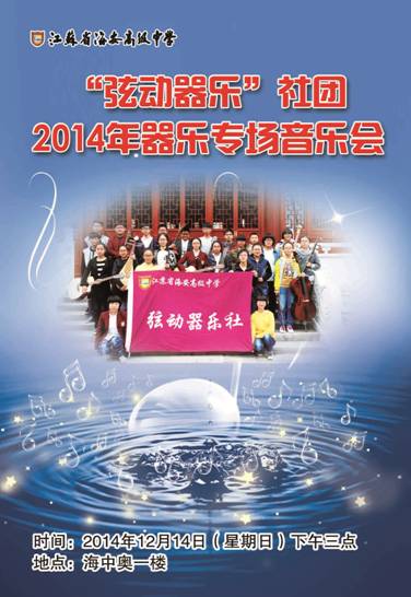 海报:“弦动器乐”社团2014年度专场音乐会 来源: 发布时间:2014-12-13 00:00:00 浏览次数: 次 【字体:小 大】 器乐社团2014年度专场音乐会震撼来袭!!!校园年度音乐盛宴将于本周日下午三点在奥林匹克楼一楼阶梯教室里激情上演,众多校园音乐达人将带来动听的音乐,来吧老师们、同学们,加入我们,和朋友一起享受校园音乐的饕餮盛宴,让音符在校园流淌!!期待大家的光临!! 校团委、校器乐社团 2014年12月13日 分享到: 【打印正文】