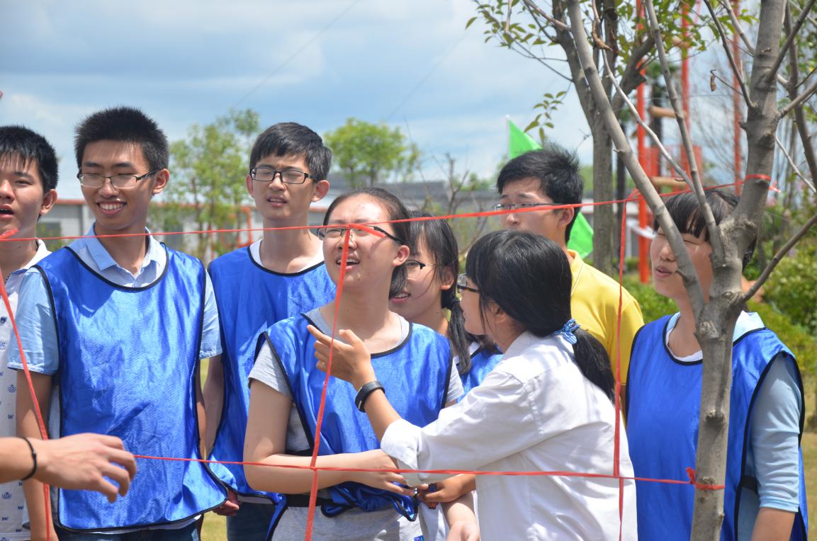 上午到达生态园后,同学们换上训练服,在教官的指导下进行了第一项活动——高空断桥。桥高约十米,钢板狭短。每一位同学站上断桥时,其他队员都会给予热情鼓励和大声加油,所有同学都奋力一跃,跳到断桥另外一侧。第二个活动是穿越电网。塑料绳在两棵树之间搭建出一个方形格子的“电网”,同学们要分别从一个格子中穿越,中途不得碰触网线,否则为违规。大家群策群力,通力合作,确定好通行格子和顺序,一个接一个在规定时间内顺利通过。上午的两项活动旨在锻炼同学们面对困境的勇气、培养团队合作的精神以及合理规划进程的能力。