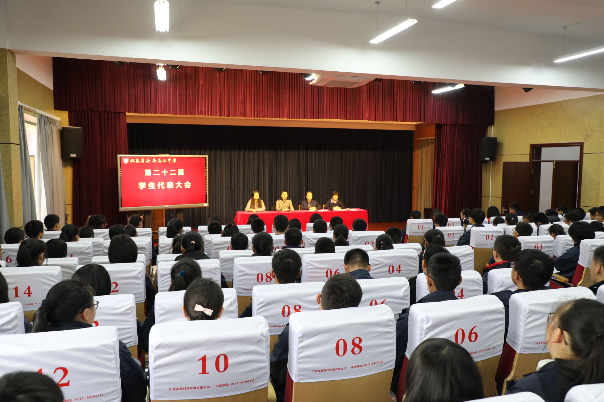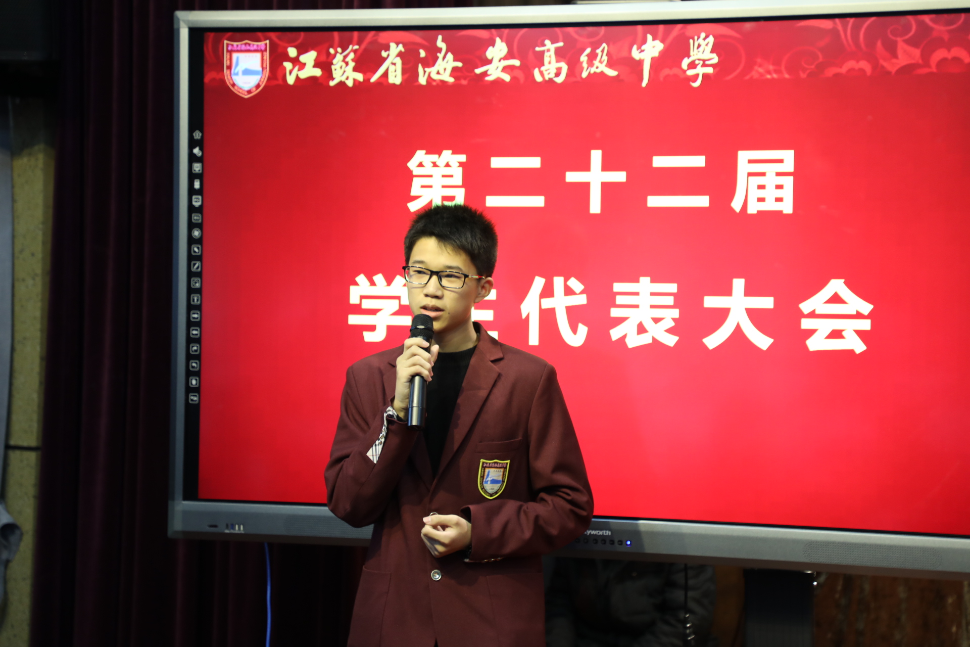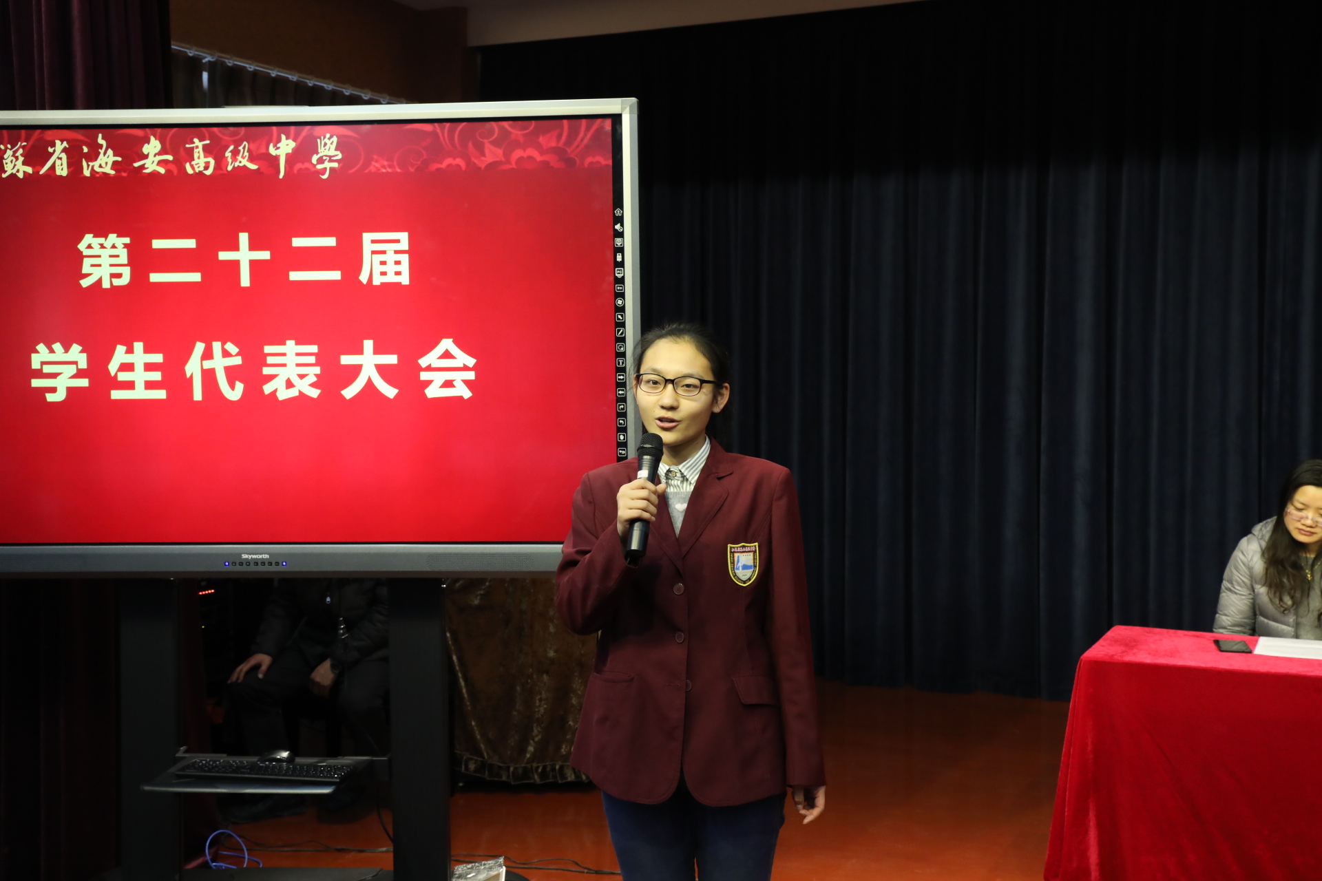 2017年11月26日下午,海安高级中学在奥二楼博雅小剧场隆重召开了第二十二届学生代表大会。出席大会的有德育处顾庆华主任,各班学生代表。会议由校团委书记罗湘军主持,团委许尧老师、缪云老师列席会议。