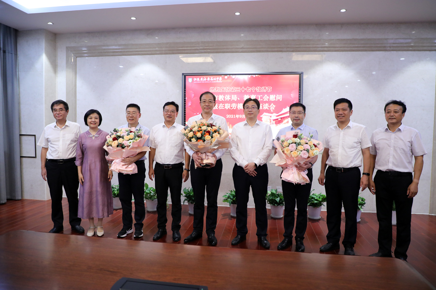 9月10日上午,在第37个教师节来临之际,海安市委教育工委书记、市教体局党组书记、局长王晨,市委教育工委副书记、市教体局党组副书记、副局长、海安教育工会主席吉清海,教育工会副主席李进等领导来海安中学慰问全国先进工作者吕建、江苏省五一劳动奖章获得者王忠、江苏省劳动模范陆海陵、南通市劳动模范周峰等四位在职劳模。海中党委书记、校长吕建,副校长杨斌、董裕华、周峰,教务处主任王忠,工会主席顾宏彬出席了慰问座谈会。