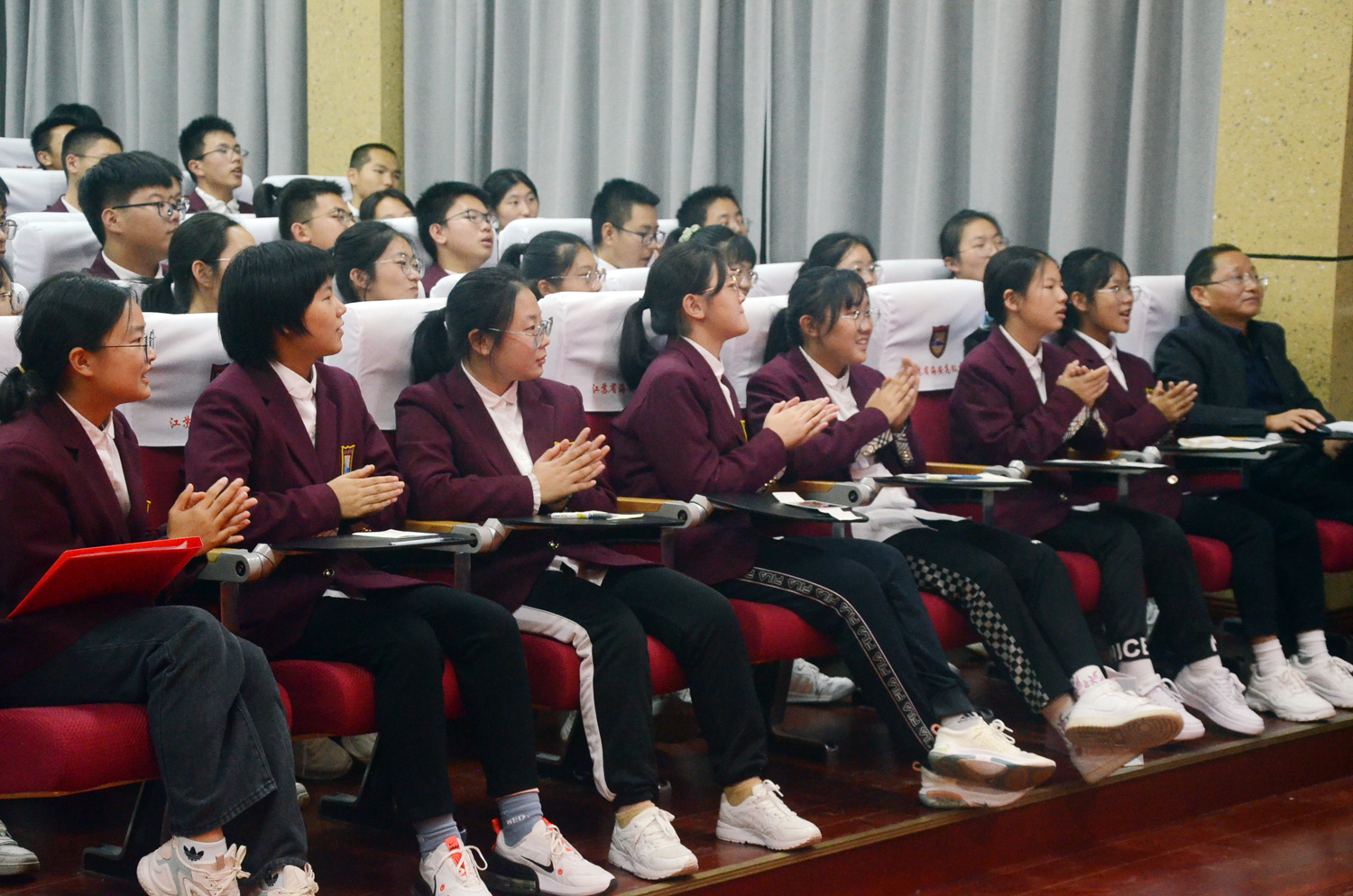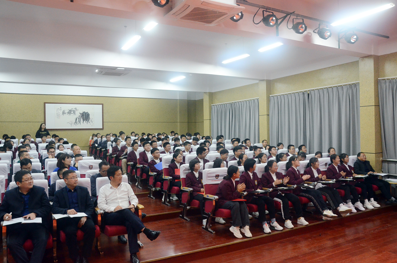 2021年10月24日晚,高一(8)班在奥林匹克楼二楼博雅小剧场举行了“追寻党史中的劳动之光”主题班会。学校董裕华、周峰副校长,校办刘建东主任、总务处张华主任、德育处王景根主任,高一、高二各班班主任和学生代表、家长代表,学生会宣传部干事和“四自”委员观摩了此次活动。本周“四自”督查小组相关同学进行了志愿引导和评价记录工作。