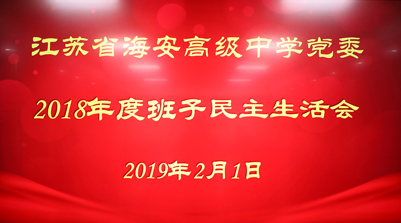 为深入学习贯彻习近平新时代中国特色社会主义思想,全面贯彻落实党中央决策部署,根据党章和党内有关规定,结合《中共中央纪委机关 中共中央组织部关于认真开好2018年度县以上党和国家机关党员领导干部民主生活会的通知》和省、市委要求,我校领导班子在深化学习研讨、广泛征求意见和开展谈心谈话的基础上,于2019年2月1日上午九点在奥林匹克楼第二会议室召开校党委领导班子民主生活会。会议由校党委书记、校长吕建主持;党委委员、副校长杨斌、董裕华、吴明山、周峰以及党委委员、两办主任曹文庆等同志参加了会议。受南通市委组织部委托,海安市委“两新”工委副书记、组织部组织科科长吴兰、市纪委派驻第十二纪检组组长王立莅临指导,市纪委派驻第九纪检组组长、市教育纪工委书记、教育局党组成员戴丽君同志出席了会议。
