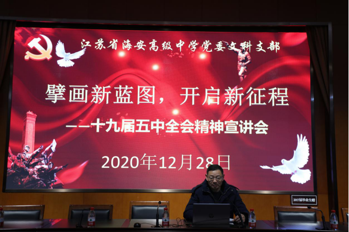 然后吕建书记结合学校的高品质示范高中建设,以《笃用笃行,勇担责任》为题对十九届五中全会精神进行了宣讲。吕建书记首先以“变革”“发展”“幸福”三个关键词宣讲了十九届五中全会给我们带来的新理念和新思路,接着他要求全体党员干部要充分认识五中全会的重大意义,深刻领会五中全会精神的内涵,把学习全会精神和建设高品质示范高中紧密结合,学深悟透、提升站位,学以致用、知行合一,广泛宣讲、营造氛围,有效衔接、科学规划。