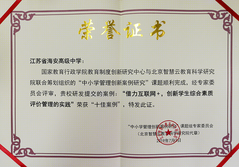 “中小学管理创新案例研究”课题组首席专家、国家教育行政学院教育制度创新研究中心主任赵宏强在大会上进行了课题成果发布。海安中学《借力互联网+,创新学生综合素质评价管理的实践》被评为“中小学管理创新十佳案例”。2004年起,我校自主研发综合素质评价系统,为每个学生建立成长坐标系,促进了学生全面而有个性的发展。该项目被列为江苏省首批前瞻性教学改革项目,2017年获省教学成果特等奖,2018年获国家级教学成果二等奖。