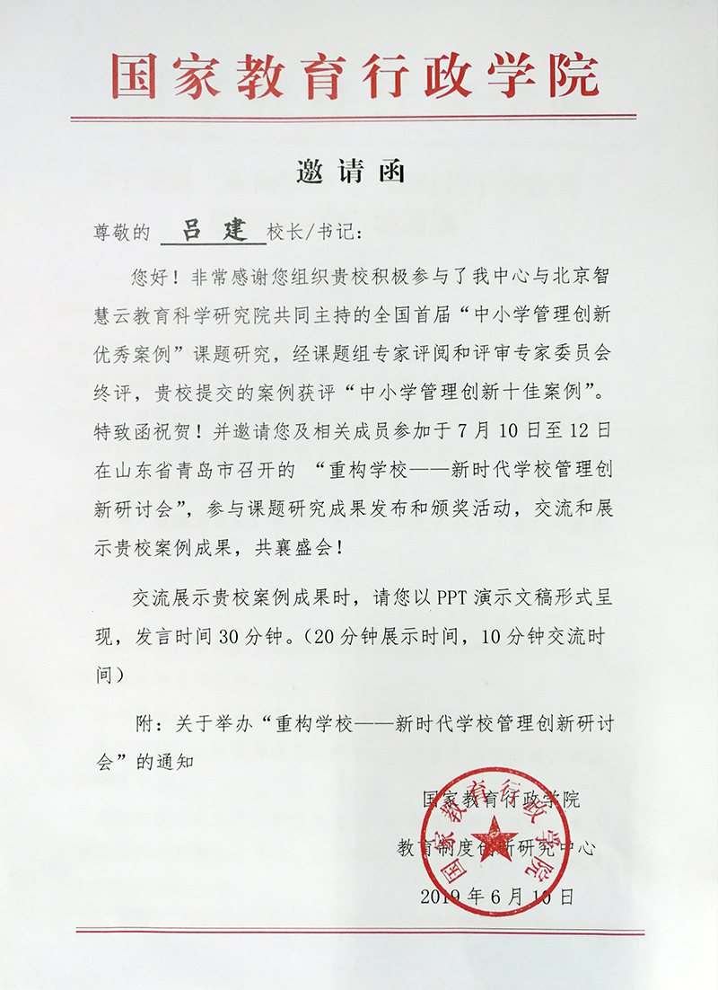 2019年7月10-12日,9323彩集团吕建校长受邀参加了在青岛西海岸新区举办的“重构学校——新时代学校管理创新研讨会”,并在大会上作了交流发言。本次会议由国家教育行政学院教育制度创新研究中心与北京智慧云教育科学研究院联合主办,青岛西海岸新区教育和体育局承办。300多位来自全国各地的教育界专家、中小学校长、教师代表参加了本次活动。国家教育行政学院原副院长李文长教授、华东师范大学基础教育改革与发展研究所所长杨小微教授、浙江省教育科学研究院方展画教授等专家进行了主旨演讲,八所学校进行了经验分享。