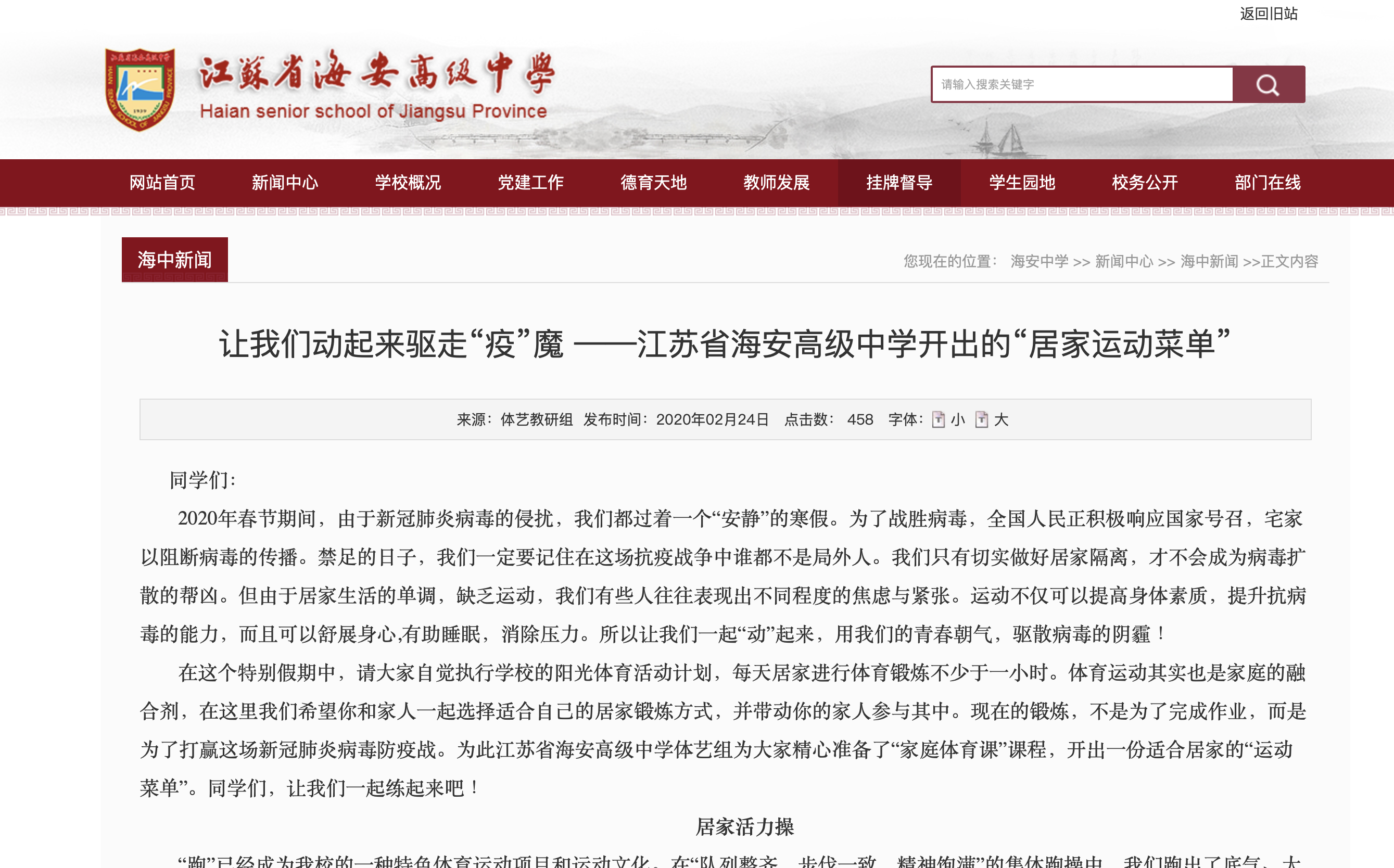 学校一直注重学生身心健康,实施“阳光体育运动”。疫情防控期间,体艺教研组研发线上体育课程,为学生开出适合居家运动的锻炼菜单,拍摄了教学示范视频,寓教于乐,注重实效。