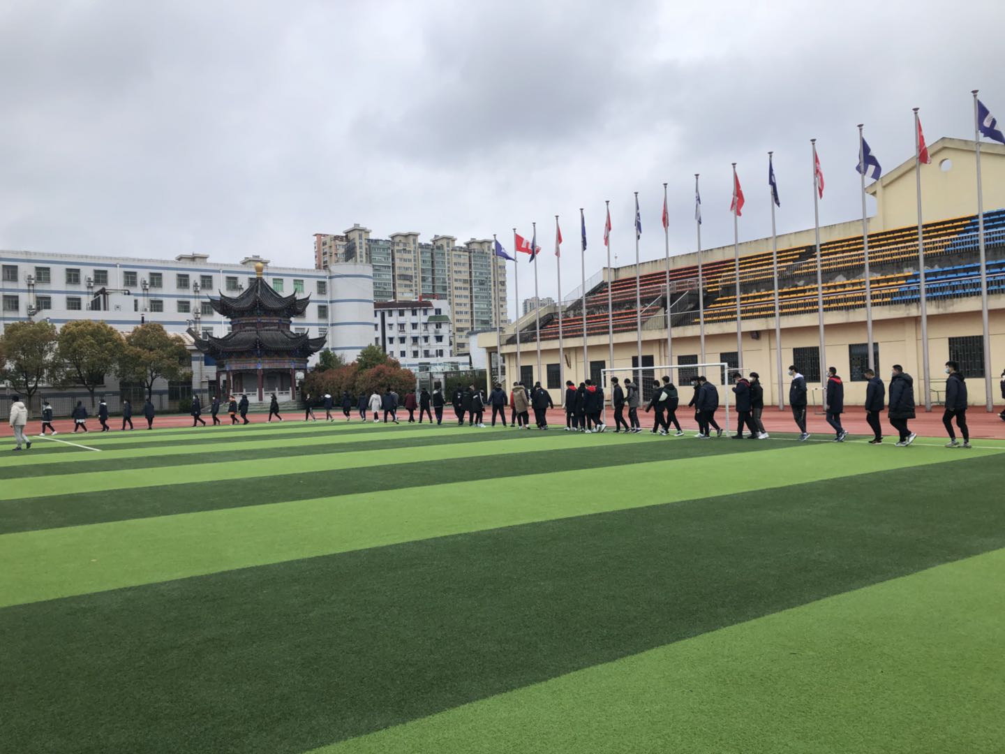 开学第一天,上午第2节课,高三(1)(2)(3)班的同学们在体育老师带领下来到田径场,学校副校长杨斌和班主任们也来到田径场,陪同学们一起锻炼,并和同学们交流情况。体育组老师们做了具体的规划和教学安排,科学统筹,确保教学安全有序。三个班的同学分散在不同的运动区,高三(1)班在操场的东南角器材区,高三(2)班在操场中间绿茵区,高三(3)班在操场的西北角田径区,在老师们指导下,科学有序地做着准备活动。