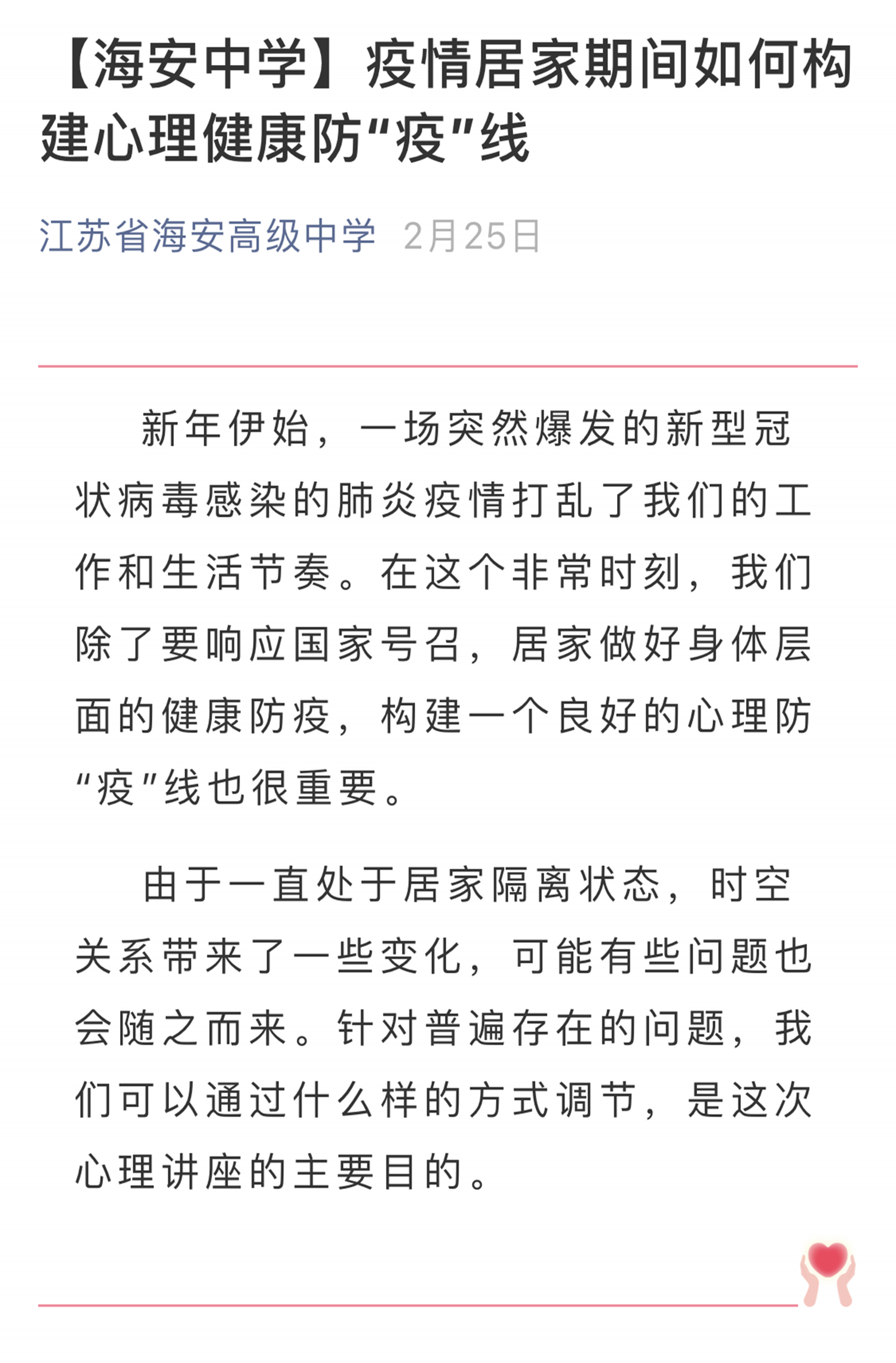疫情防控期间,学校还安排了线上心理课程,研发了“疫情居家期间如何构建心理健康防‘疫’线”心理健康微课和讲座,提供心理咨询与服务热线专线,为学生安心宅家、调整心态、做好规划保驾护航。