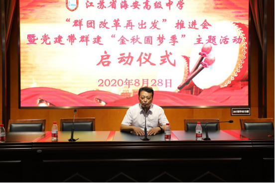 党委委员杨斌副校长首先带领大家学习了海安市委组织部等五部门联合下发的《“党建带群建,建功走在前”服务高质量发展的十条措施》《海安市“党建带群建,建功走在前”季度主题活动共办制度》和《海安市党建带群建“金秋圆梦季”主题活动方案》