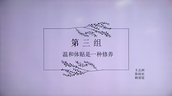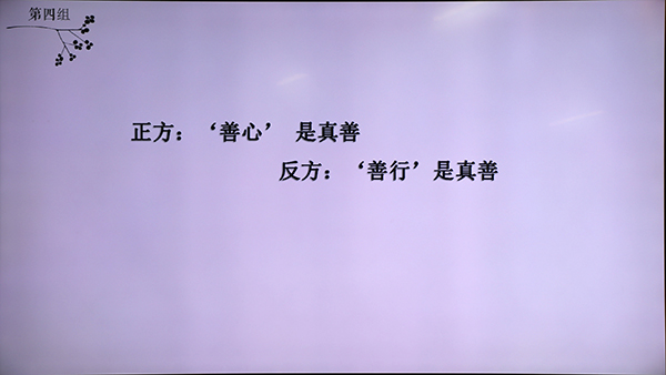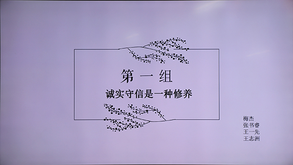 主题班会由一段采访视频作为开始。通过各位受访者对“你所认为的有修养的行为”的回答引发了各位同学对于修养问题的思考。接着,同学们带来了情景剧表演,通过精彩的表演,同学们想要传递的是“诚信”的美好品德,希望大家都当一个诚实的人。情景剧结束,在主持人的介绍下,参加班会课的同学们进行了现场交流,围绕“阅读修身”的话题抒发了自己的见解。紧随其后,同学们以座谈会形式开展了对于“生活细节里的修养”问题的思维碰撞,参与者各抒己见,进行了精彩的交流。最后,围绕“善心和善行,哪个是真善?”的主题,两个班级的同学展开了激烈的辩论,在精彩的辩论赛中本次主题班会圆满落幕。