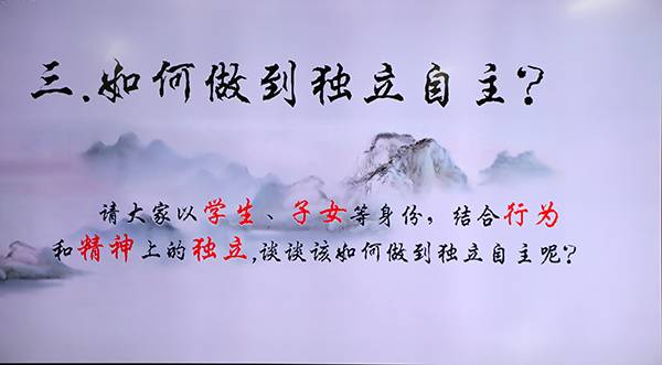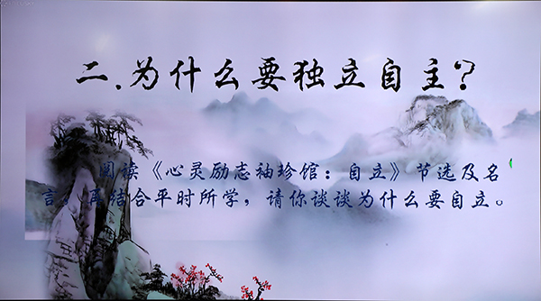 丁茂元等同学带来的情景剧《独立与依赖》,让大家进一步了解了自立的重要性。在这一环节中,同学们还相继发表了对独立自主所需具备品质的看法。周骥同学的诗朗诵《风骨仙去少年立》,使大家热血沸腾。随后,同学们对今日的所闻所感所悟进行了总结,收获颇多。