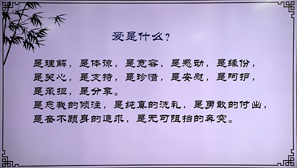 在情景朗诵环节中,周萌等同学表演的《仁爱孔子》,充分体现了仁爱之美;李誉、洪楚齐等同学带来的情景剧《仁义胡同》,向大家展现了仁爱的魅力;张晨霞和生铭捷同学则通过生动的诗朗诵,表现了仁爱的重要性。